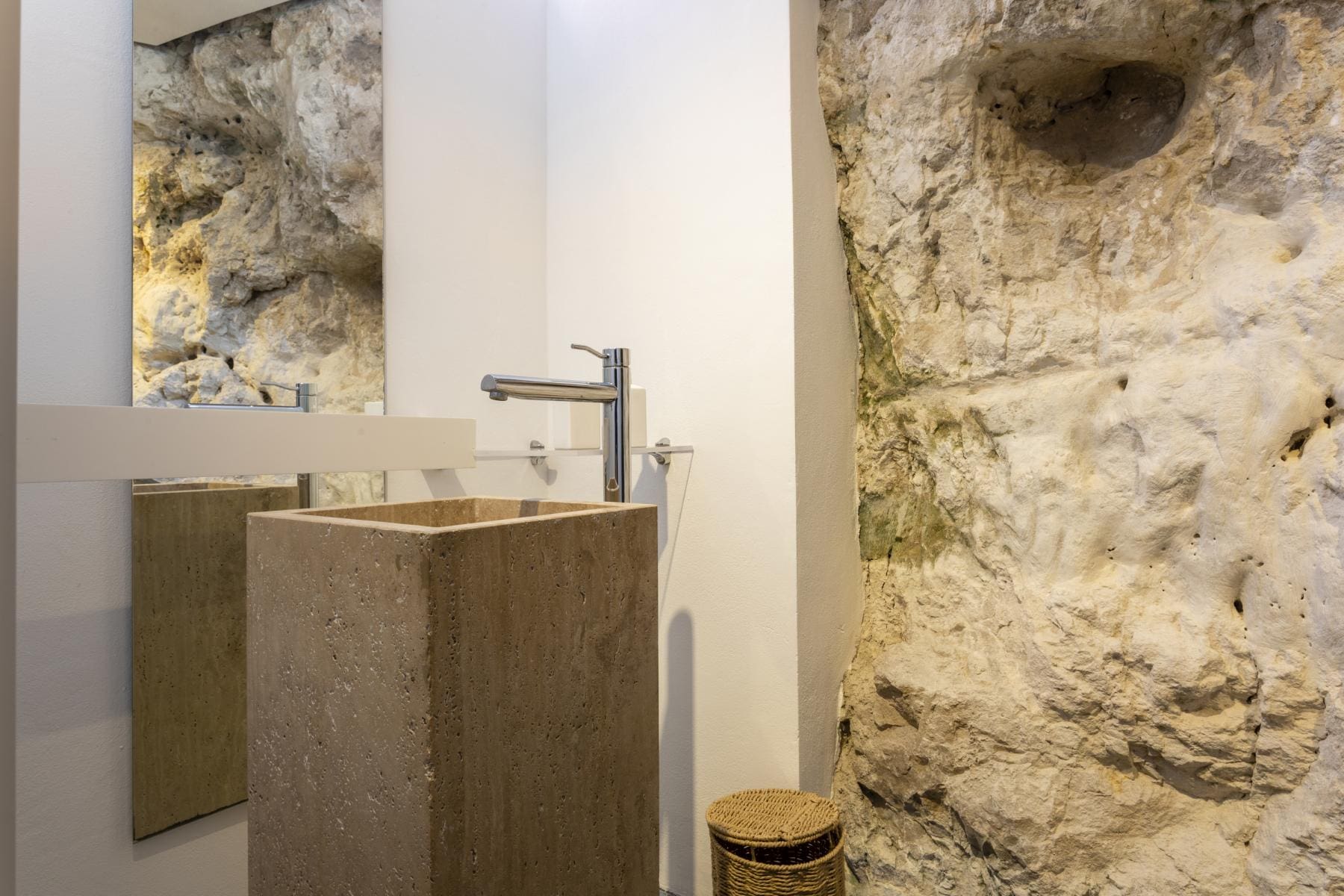 Step inside and be enveloped by the serene atmosphere created by the natural rock walls and minimalist design. This apartment is thoughtfully divided into two independent living spaces, perfect for couples or families seeking both privacy and connection. The ground-floor studio features a kitchenette and bathroom, while the main house above offers a full kitchen and a cozy living area. Each of the two bedrooms is designed for relaxation, with the second bedroom accessible by steps, adding a unique charm to the layout.