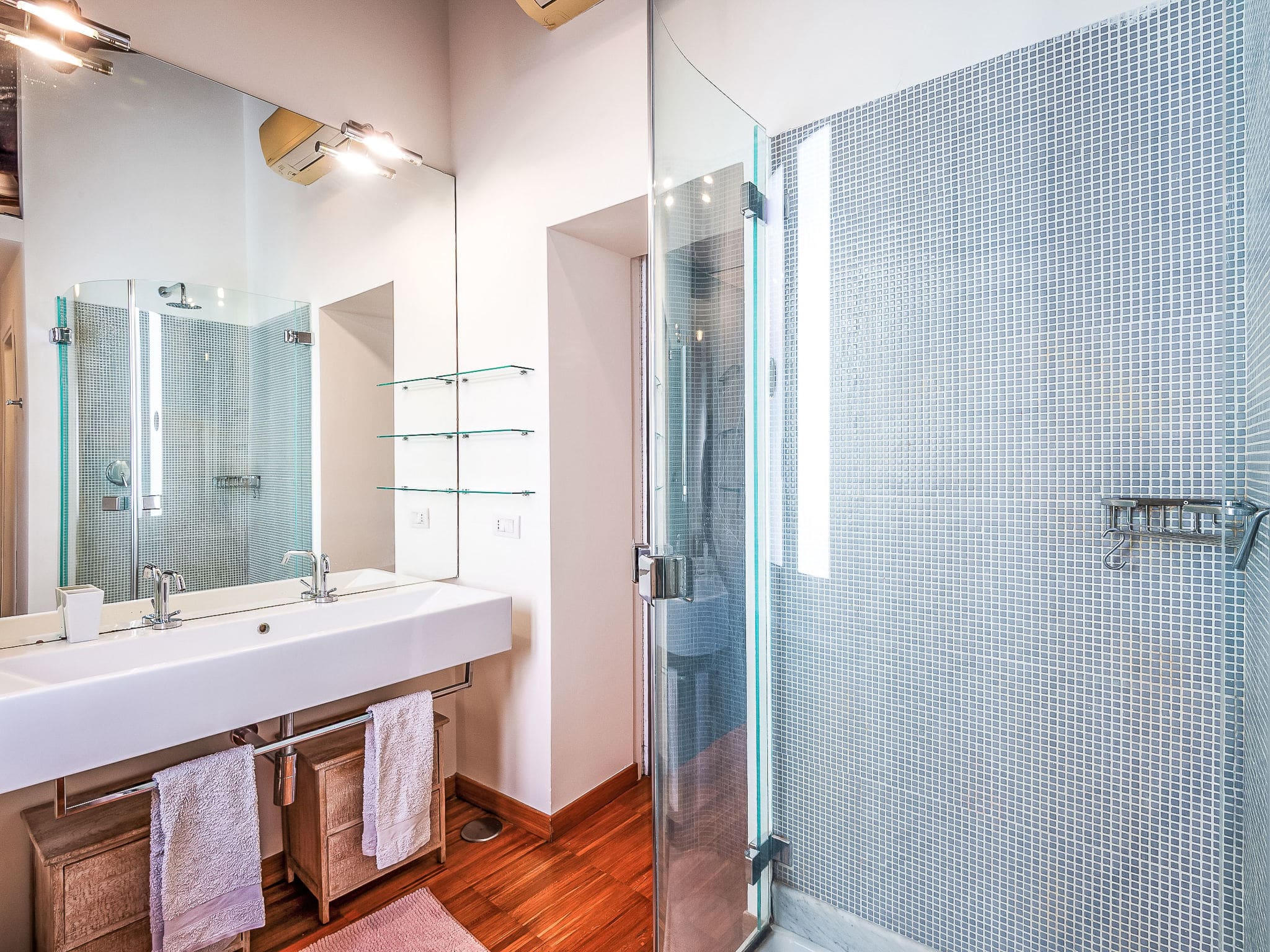 The compact yet well-equipped kitchen includes premium appliances including a five-ring gas hob, oven, dishwasher, toaster and kettle, allowing you to prepare everything from morning espresso to elaborate Italian feasts. The bathroom features a shower, bidet, WC and double hand-basin, maintaining traditional Italian elegance with modern convenience. Gas heating and air-conditioning ensure year-round comfort, while city views from the windows provide glimpses of Roman rooftops and daily neighbourhood life.