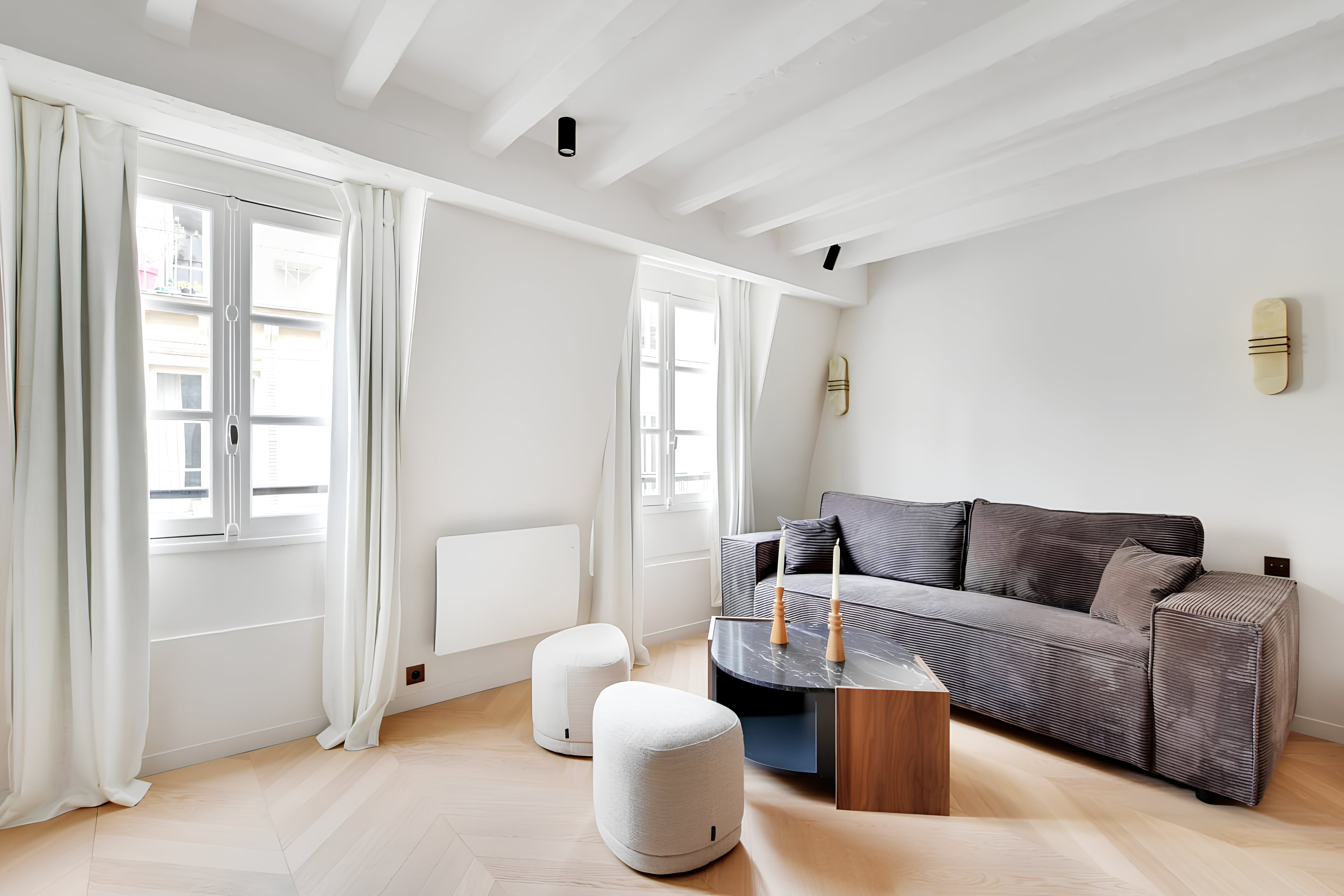 The apartment comfortably accommodates up to four guests, with one bedroom and two bathrooms ensuring convenience and privacy. While the living area can feel snug when the sofa bed is in use, the apartment’s thoughtful layout ensures comfort for all. Please note that street noise can be present during peak times. For further options, browse our luxury villa rentals in France.
