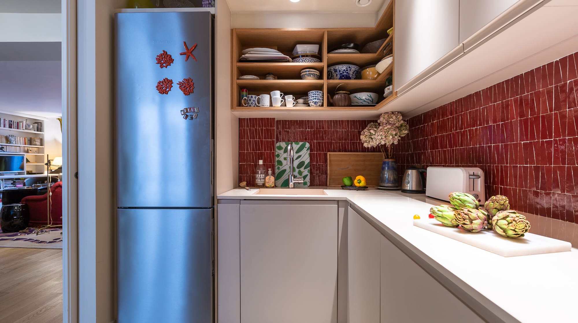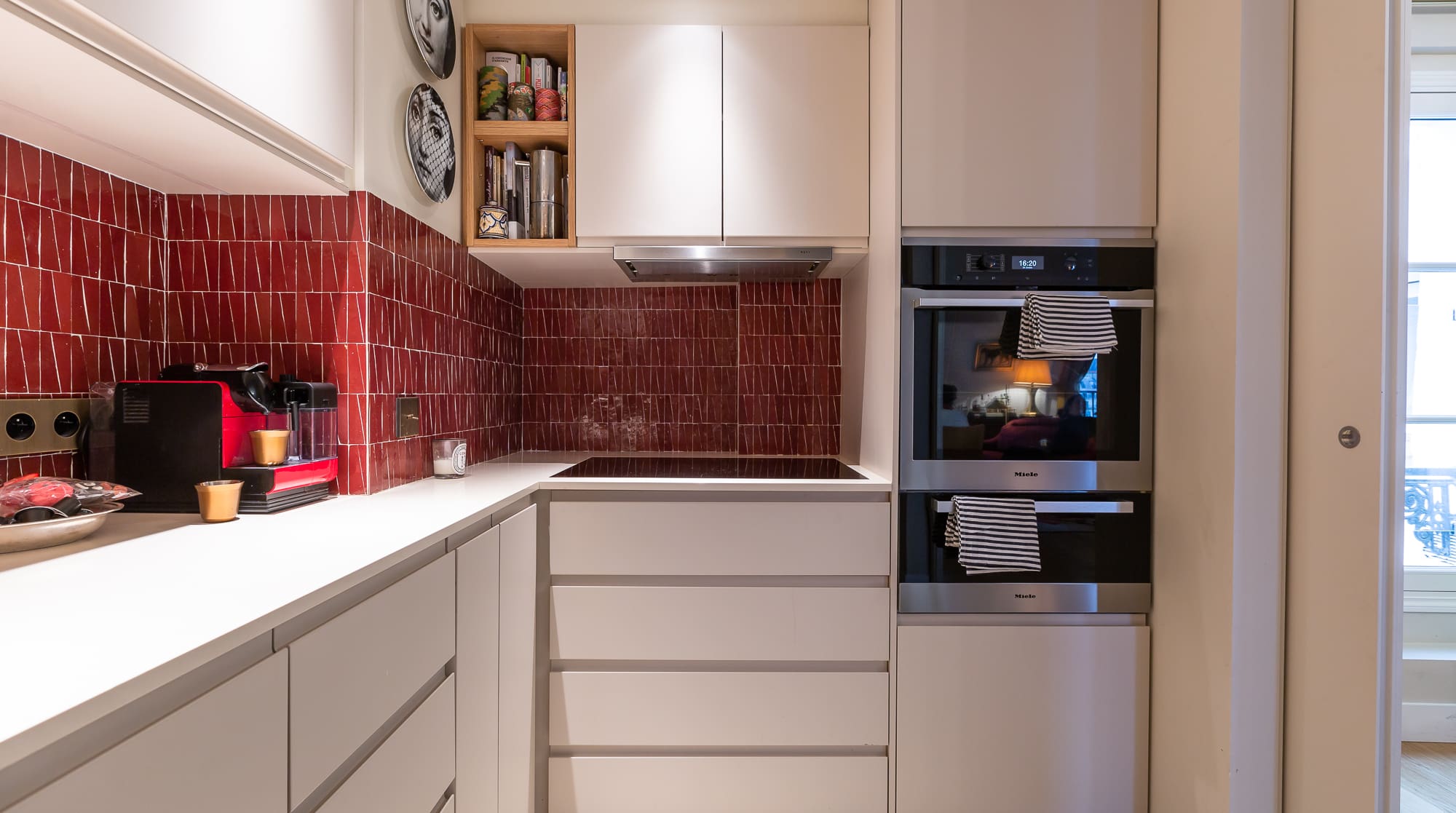 Step inside and be welcomed by the apartment’s stylish interior, where eclectic maximalism meets contemporary elegance. The spacious living room features a plush double-sided red couch, perfect for relaxing after a day of exploration. Gold curtains frame picturesque views of the historic Saint-Germain-l’Auxerrois church and the iconic Louvre. The dining area, with its chic furnishings, provides a delightful setting for meals. The kitchen is fully equipped with modern appliances, ensuring convenience for your culinary endeavors. Each bedroom is a sanctuary of comfort, adorned with floral wallpaper and vibrant accents, offering a restful escape for up to 5 guests.