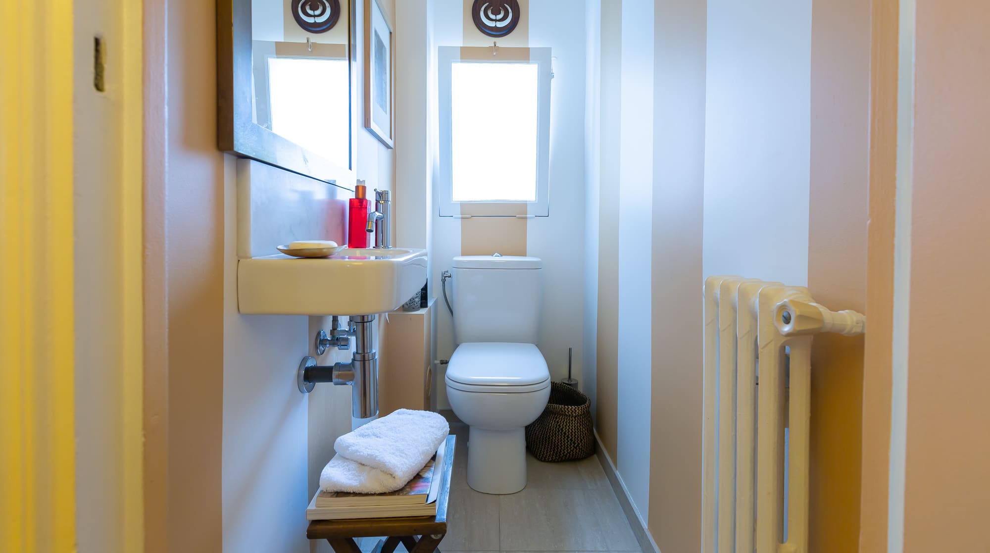 Step inside to find beautifully appointed interiors that exude warmth and sophistication. The parquet floors and antique furnishings are complemented by modern touches, creating a harmonious living space. The living room, bathed in morning light, invites you to unwind with a book from the extensive bookshelves. The contemporary kitchen is fully equipped, perfect for preparing delicious meals. Each of the two bedrooms offers a serene retreat, featuring comfortable bedding and ample storage space. The main bathroom boasts a luxurious bathtub, while the second bathroom, equipped with a shower and basin, offers additional convenience.