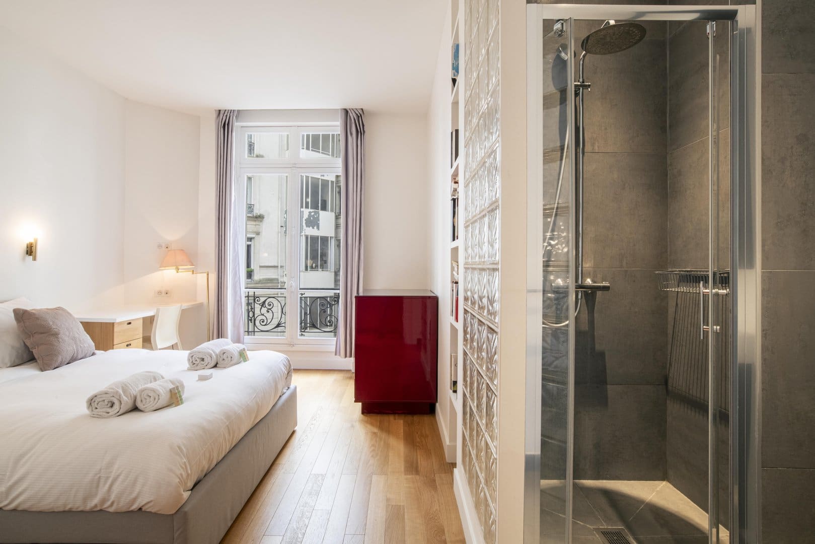 Though the apartment is nestled within the vibrant streets of Paris, it offers a lovely private balcony where guests can enjoy their morning coffee or evening wine while taking in the surrounding architectural beauty. While the balcony is narrow, it’s an inviting spot to appreciate the bustling Parisian atmosphere. The apartment’s location also provides easy access to the nearby Luxembourg Gardens, perfect for a leisurely stroll or a family picnic.