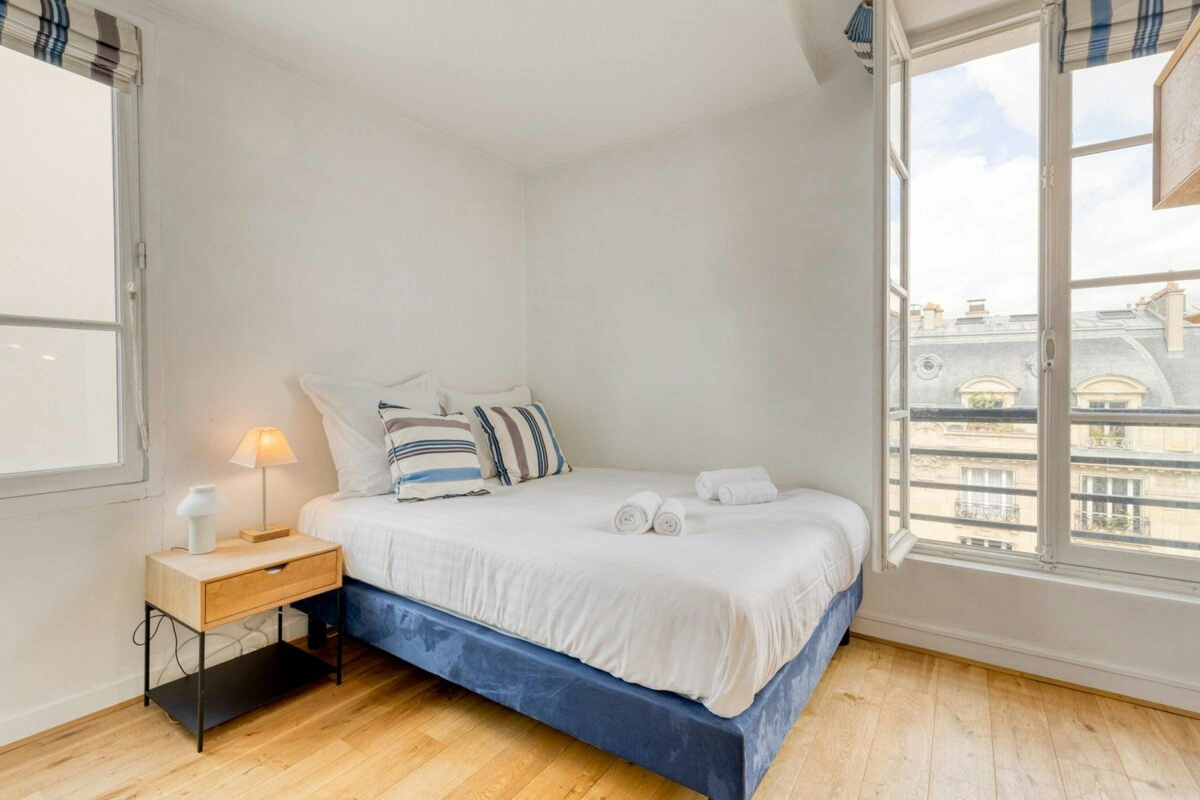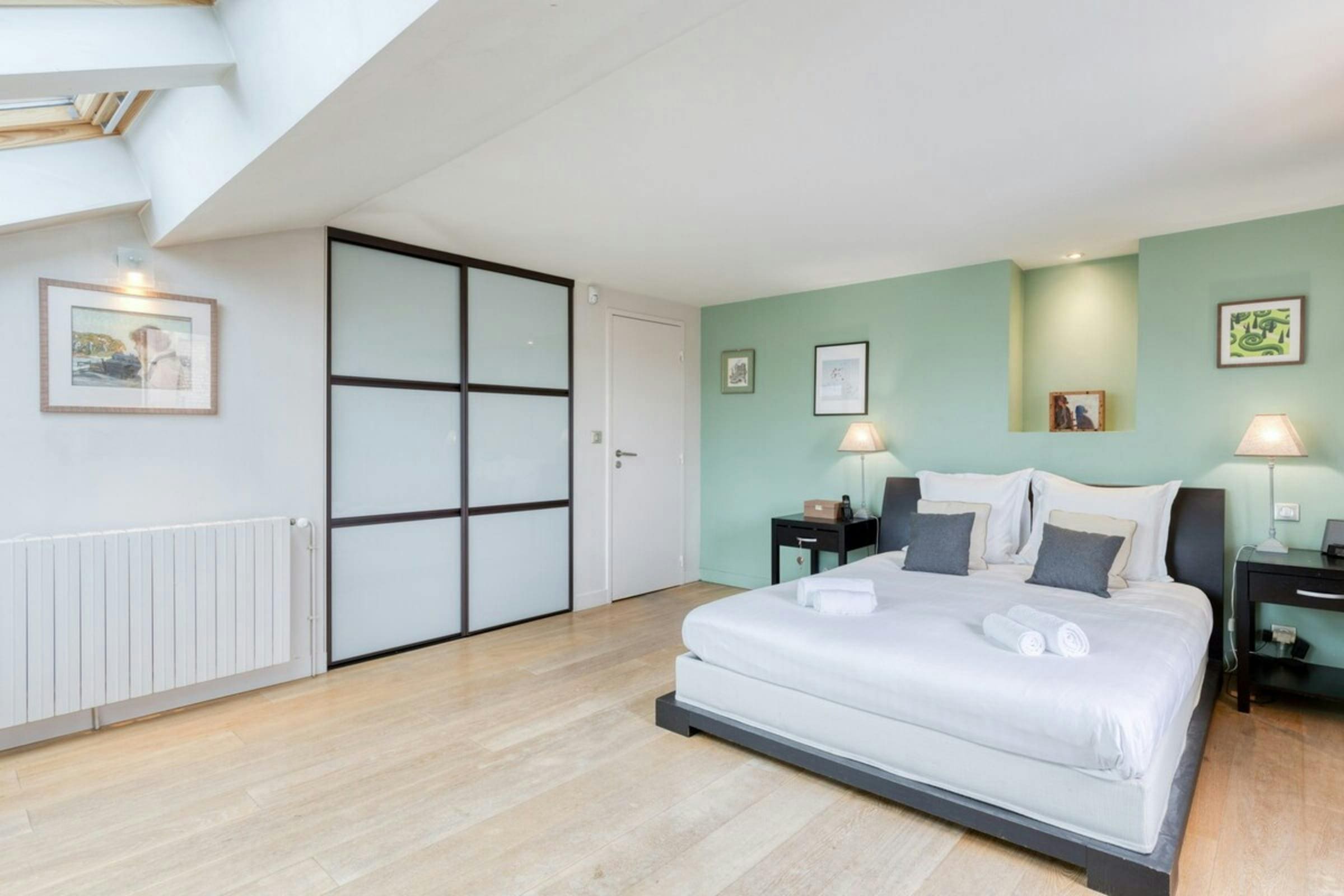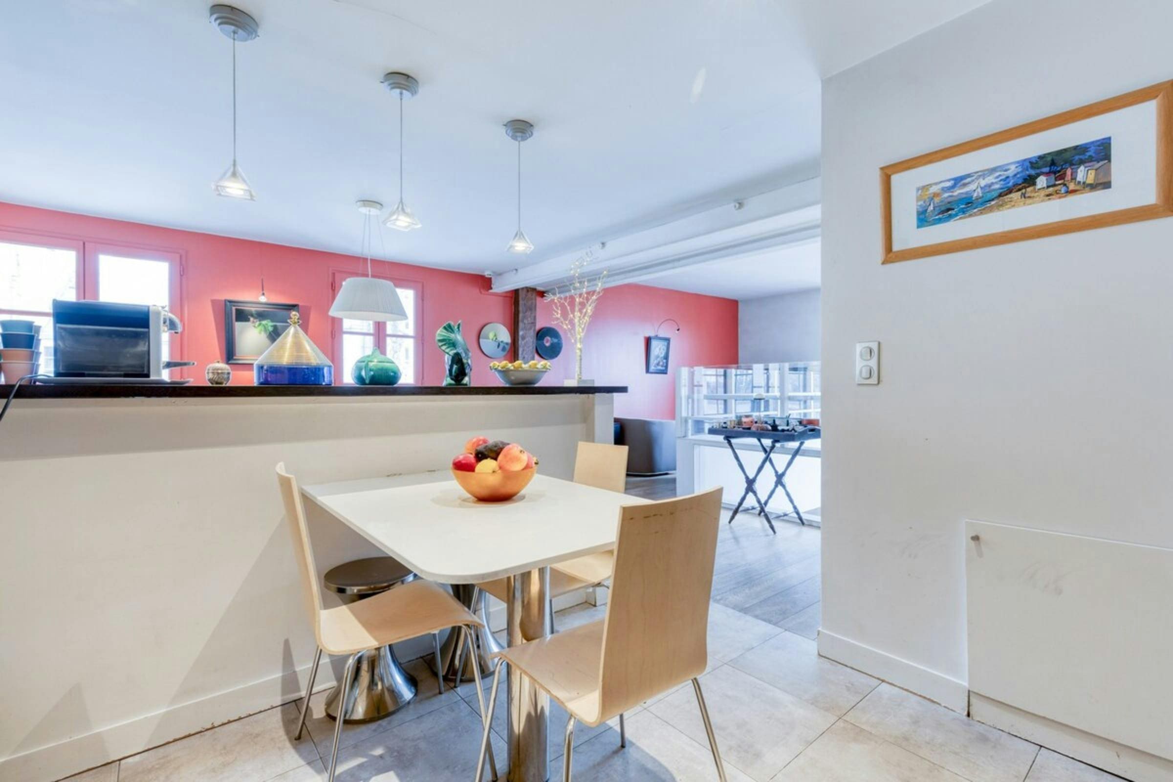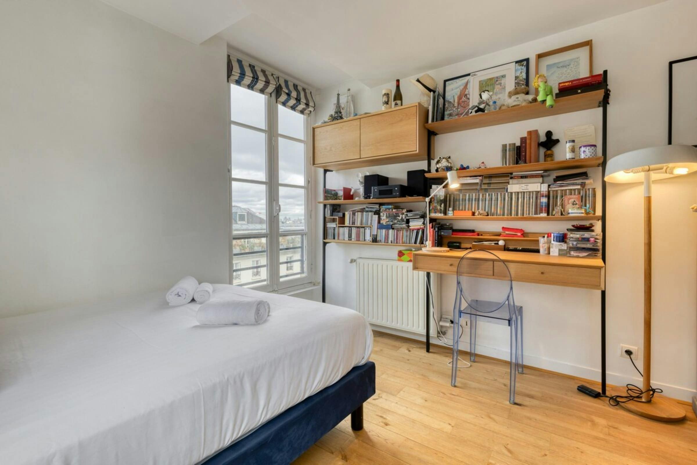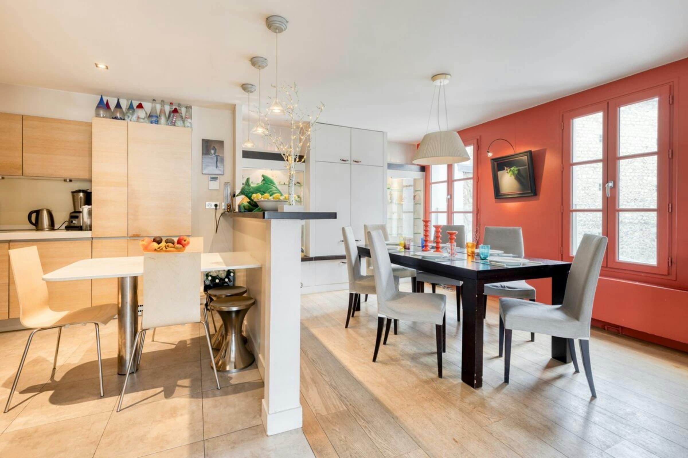 Spread across four floors, this luxury apartment rental Paris boasts a thoughtfully designed interior that exudes style and sophistication. The spacious living area invites relaxation with plush seating and tasteful decor, while the modern kitchen-diner is perfect for enjoying a leisurely breakfast. The apartment features two beautifully appointed bedrooms with air conditioning for your comfort, alongside three elegant bathrooms. An office space with a sofa bed accommodates additional guests, making this property ideal for family stays or group getaways.