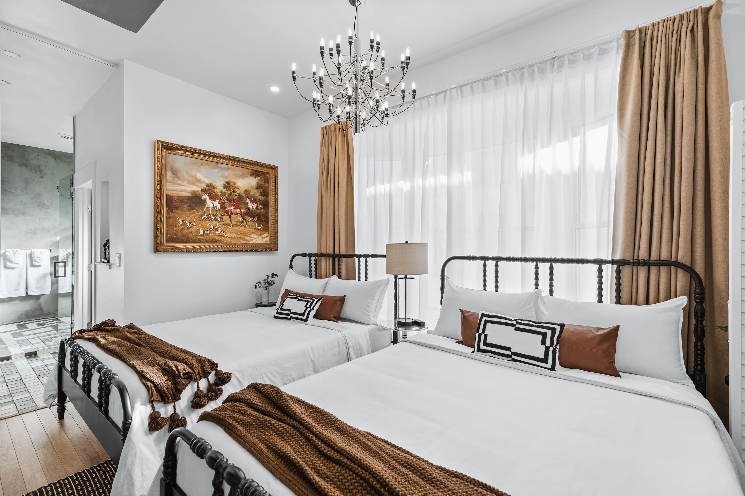 Step inside to discover an elegant blend of modern decor and classic charm. The spacious living area is perfect for relaxation, featuring plush seating and a state-of-the-art entertainment system. The gourmet kitchen is equipped with high-end appliances and ample counter space, ideal for preparing meals for family gatherings. With four beautifully appointed bedrooms, including a loft with three single beds perfect for children, everyone will find their own comfortable space. The main bathroom offers a luxurious escape with its clawfoot tub, perfect for unwinding after a day of exploration.