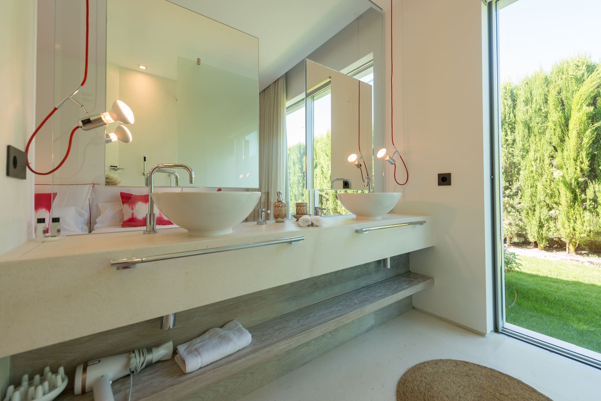 Casa Es Vedrà San José accommodates up to 8 guests in 4 bedrooms, each with its own bathroom. The property offers secure parking, 24-hour security, and boat access to the nearby bay. Cleaning services are provided daily, except Sundays. Browse our luxury villa rentals in Spain for more properties.