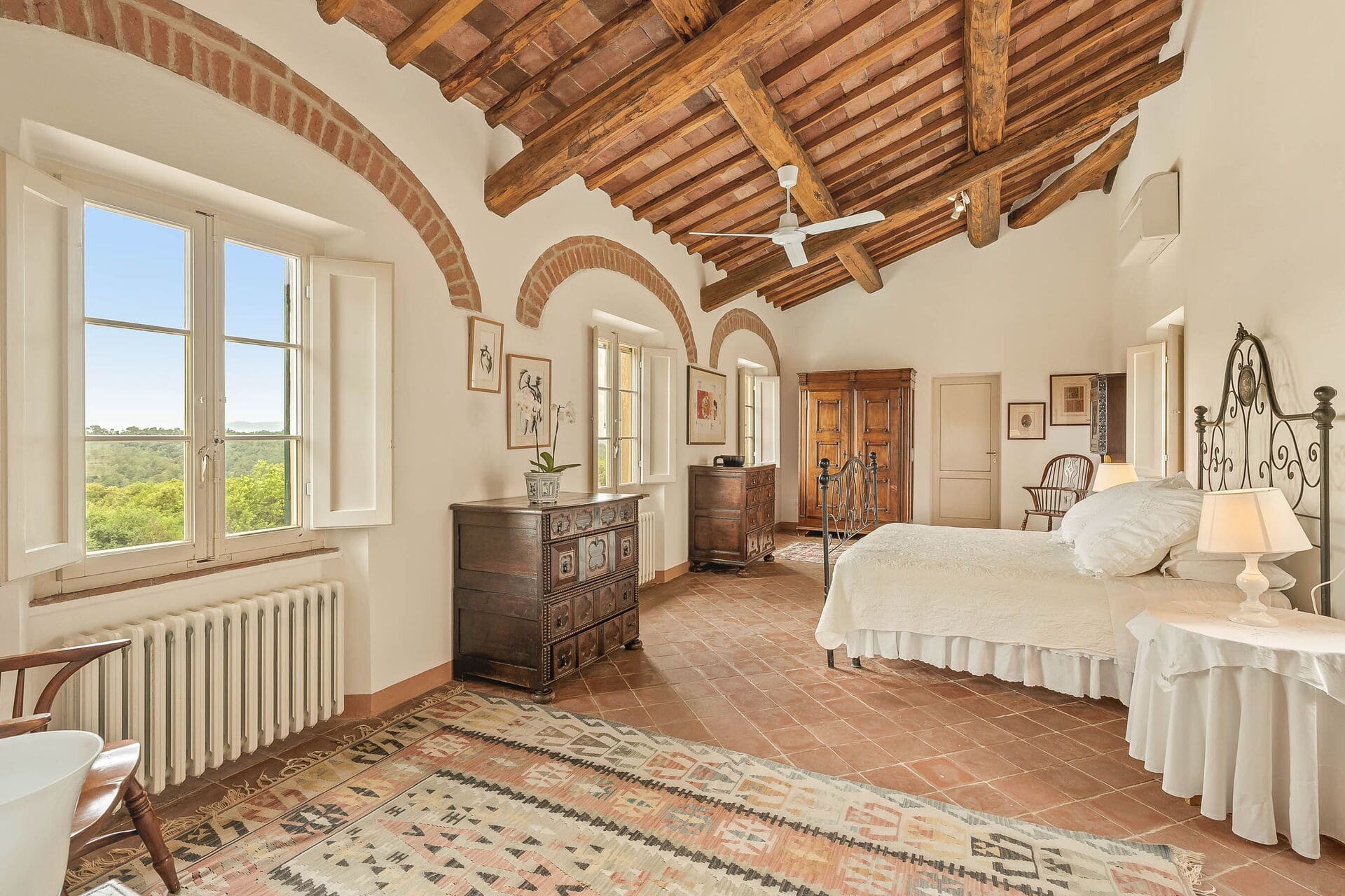 The interior of this San Miniato apartment rental exudes elegance and comfort. The main house hosts five beautifully appointed bedrooms, complemented by a separate two-bedroom guest house. Each room is designed with meticulous attention to detail, ensuring a harmonious blend of classic Tuscan style and modern amenities. The spacious living area is perfect for relaxation, while the fully equipped kitchen caters to all culinary needs. With air conditioning available in all bedrooms, guests can enjoy a restful sleep even during the warmer months.