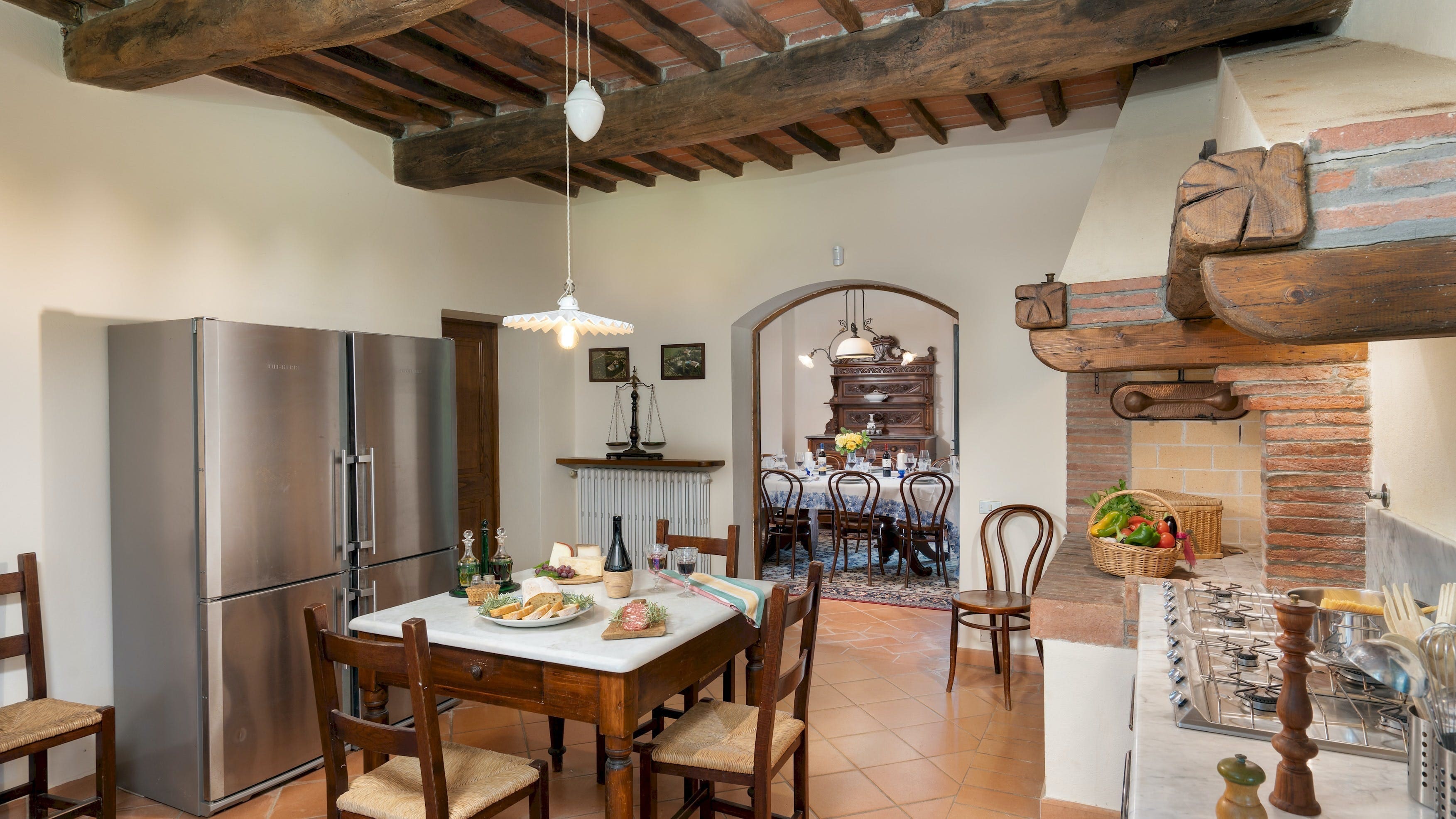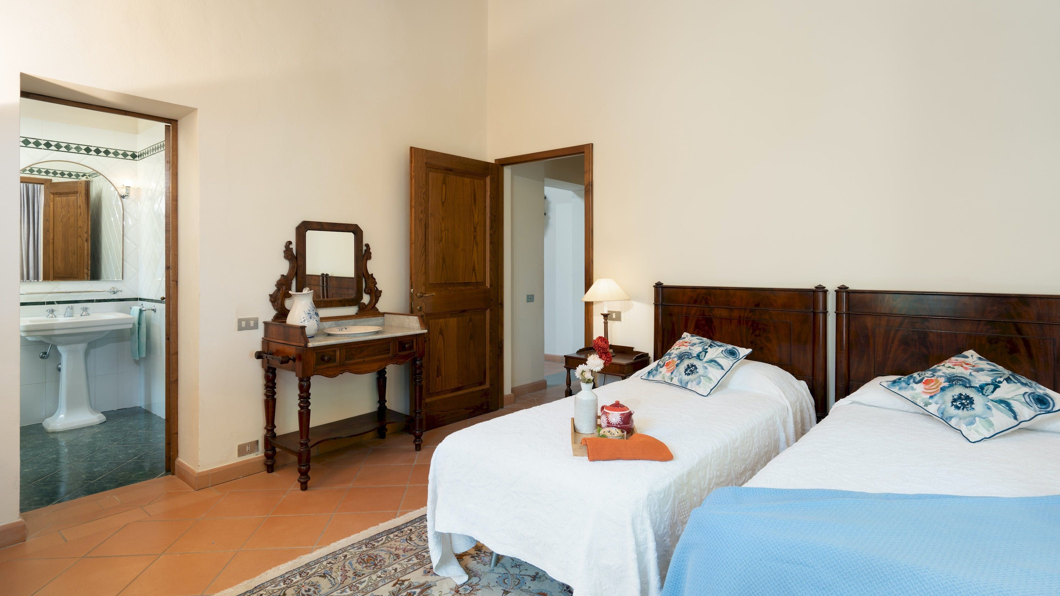 Step inside and experience the harmonious blend of traditional Tuscan architecture and contemporary luxury. The apartment boasts four spacious bedrooms, each with its own en-suite bathroom, ensuring privacy and convenience for up to eight guests. Exposed wooden beams and rustic brickwork speak to the property’s storied past, while the modern kitchen and living areas provide all the comforts of home. The twin bedroom can be converted into a double upon request, providing flexible sleeping arrangements.