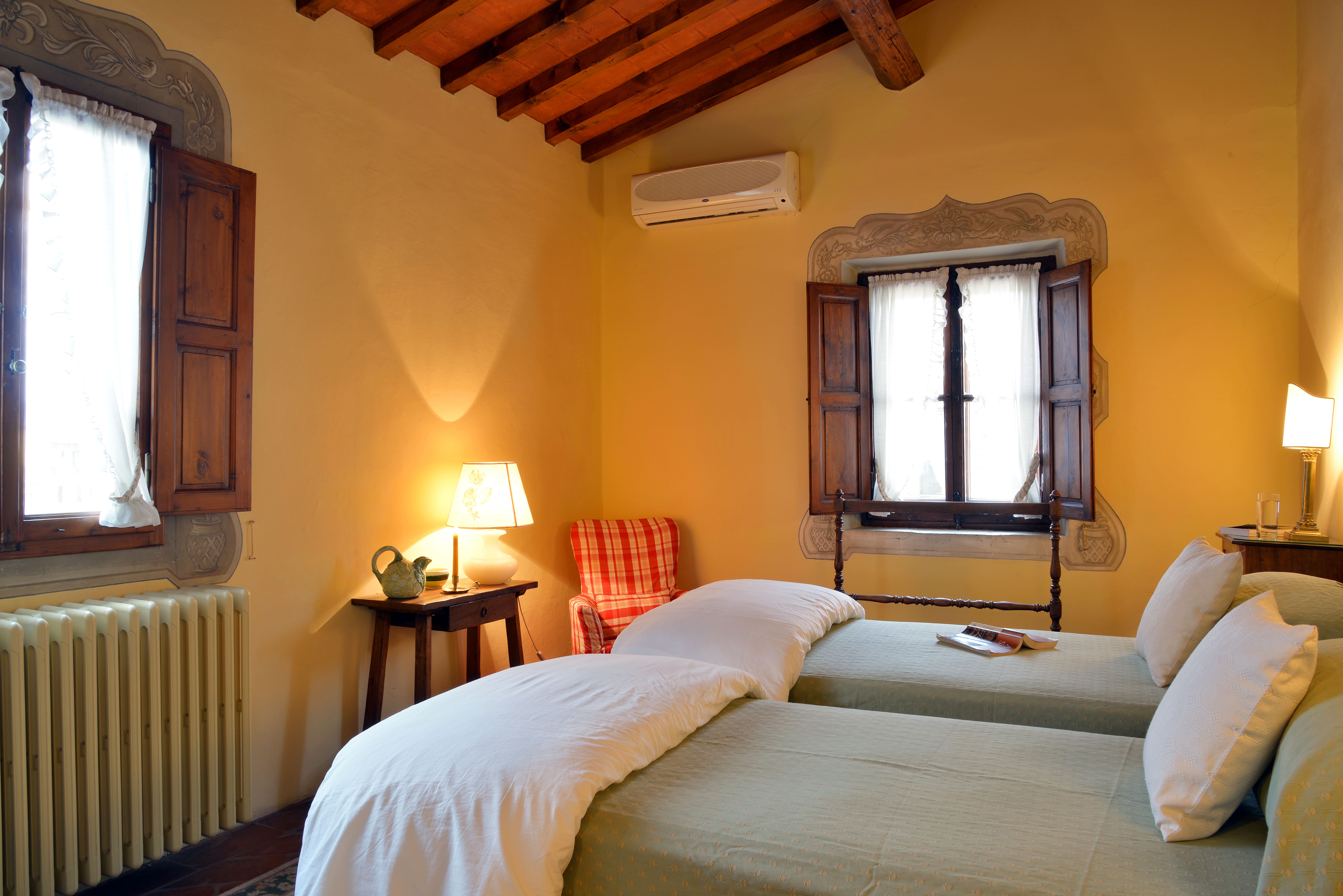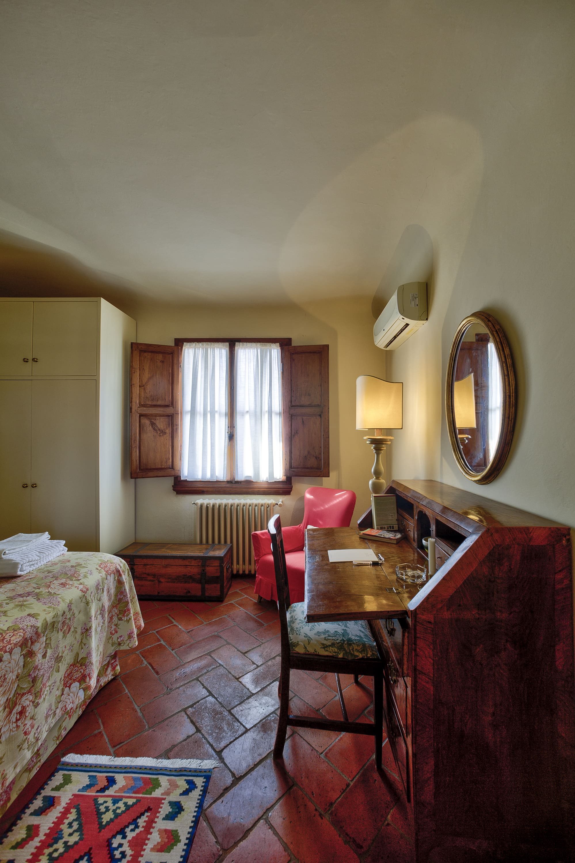 Step inside to discover an interior that seamlessly combines elegance with functionality. The living area is adorned with classic Italian artwork and heavy wooden furniture, offering an authentic ambiance. The kitchen, with its breathtaking views of San Minato al Monte, is equipped with all modern amenities for your culinary adventures. Two beautifully appointed bedrooms provide restful retreats; the main bedroom even features a versatile desk for remote work needs. For added flexibility, the double bed can be converted into twin beds.