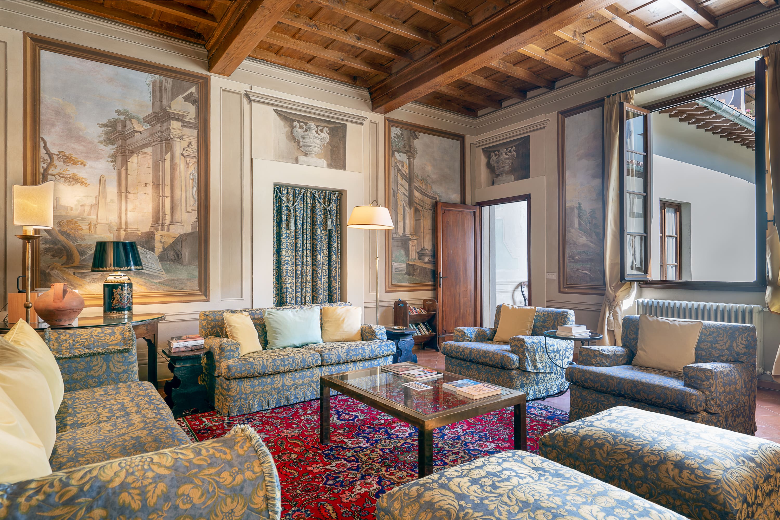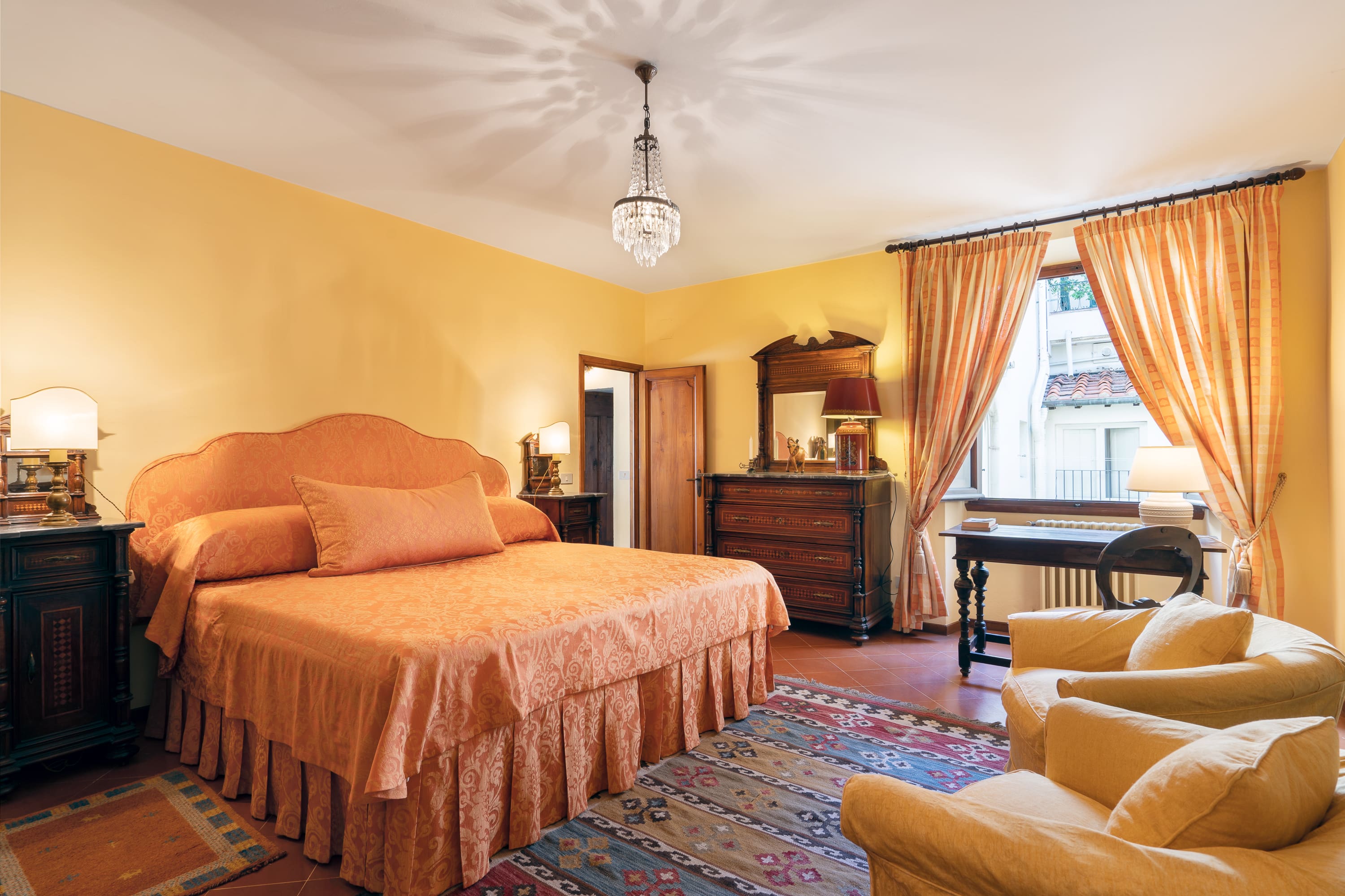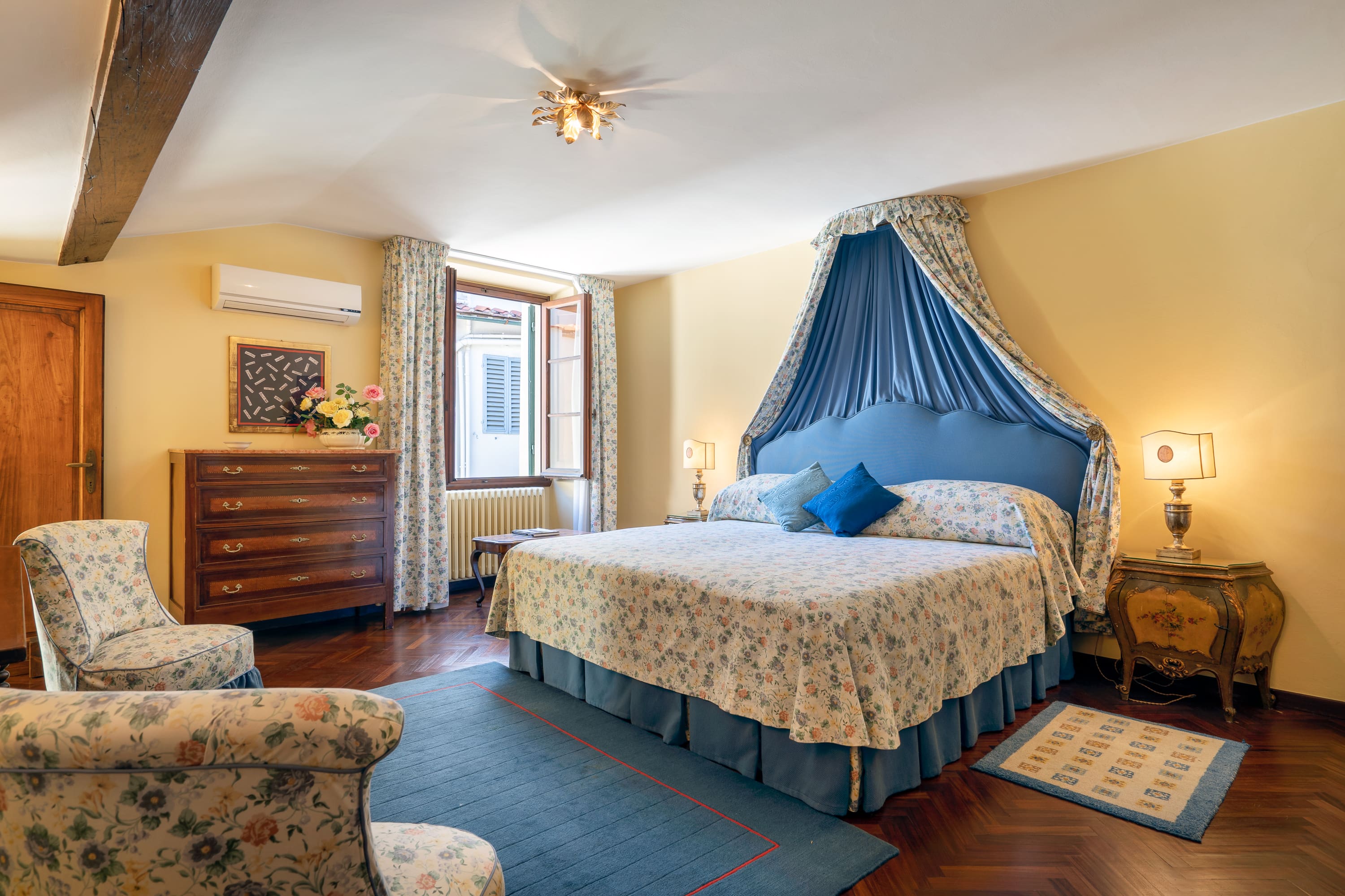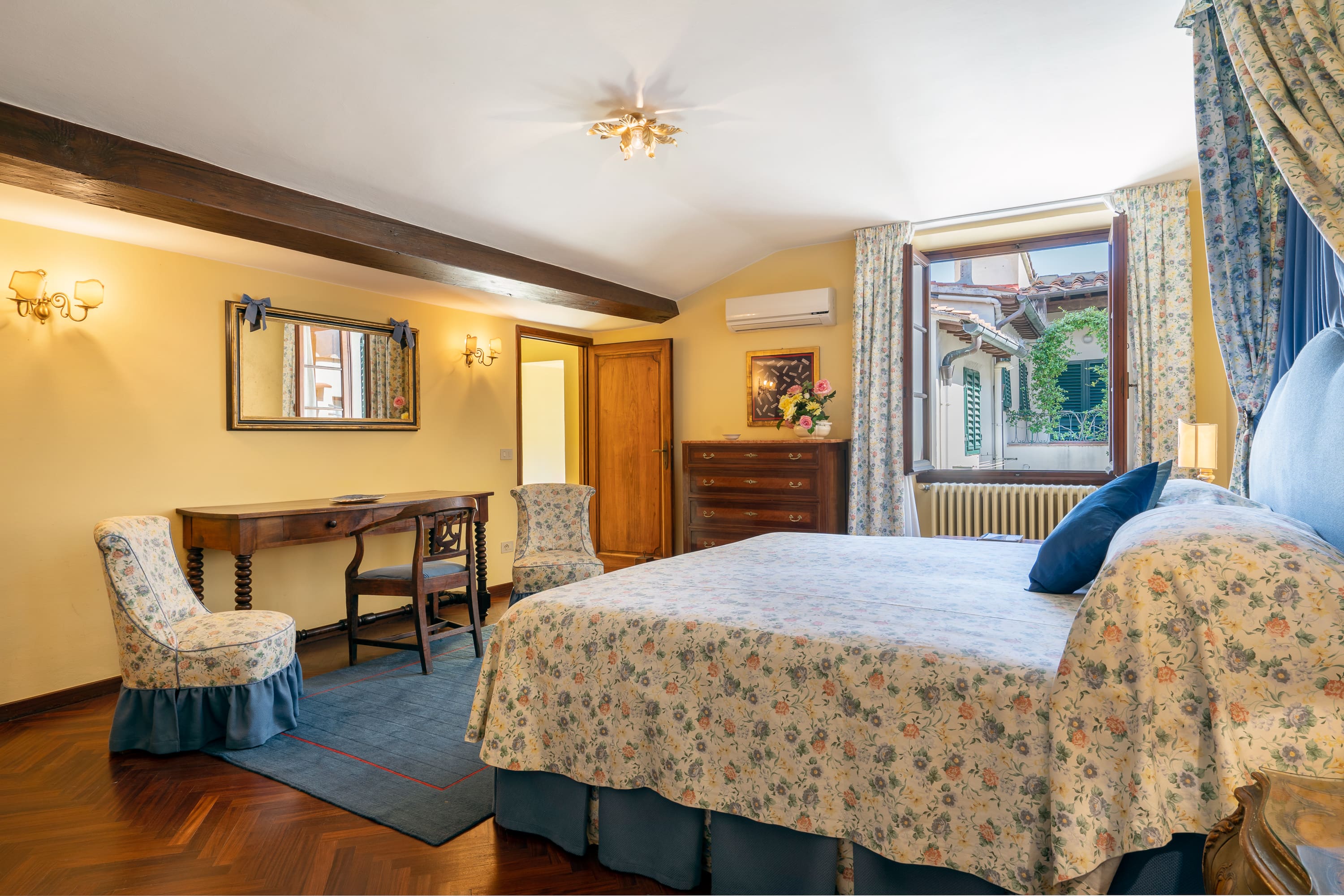 Step into a world of elegance as you enter this luxury apartment in Florence. The interior boasts frescoed walls and original 16th-century wood beam ceilings that transport you back in time. Tall windows flood the spacious living areas with natural light, offering views of a serene private courtyard. The apartment features three beautifully appointed bedrooms, with the second bedroom offering a versatile king-size bed that can be converted into two singles if needed. A cozy sofa bed in the living room accommodates an additional guest, ensuring comfort for up to seven guests. The apartment is equipped with modern amenities, including air conditioning and workspaces ideal for remote work.
