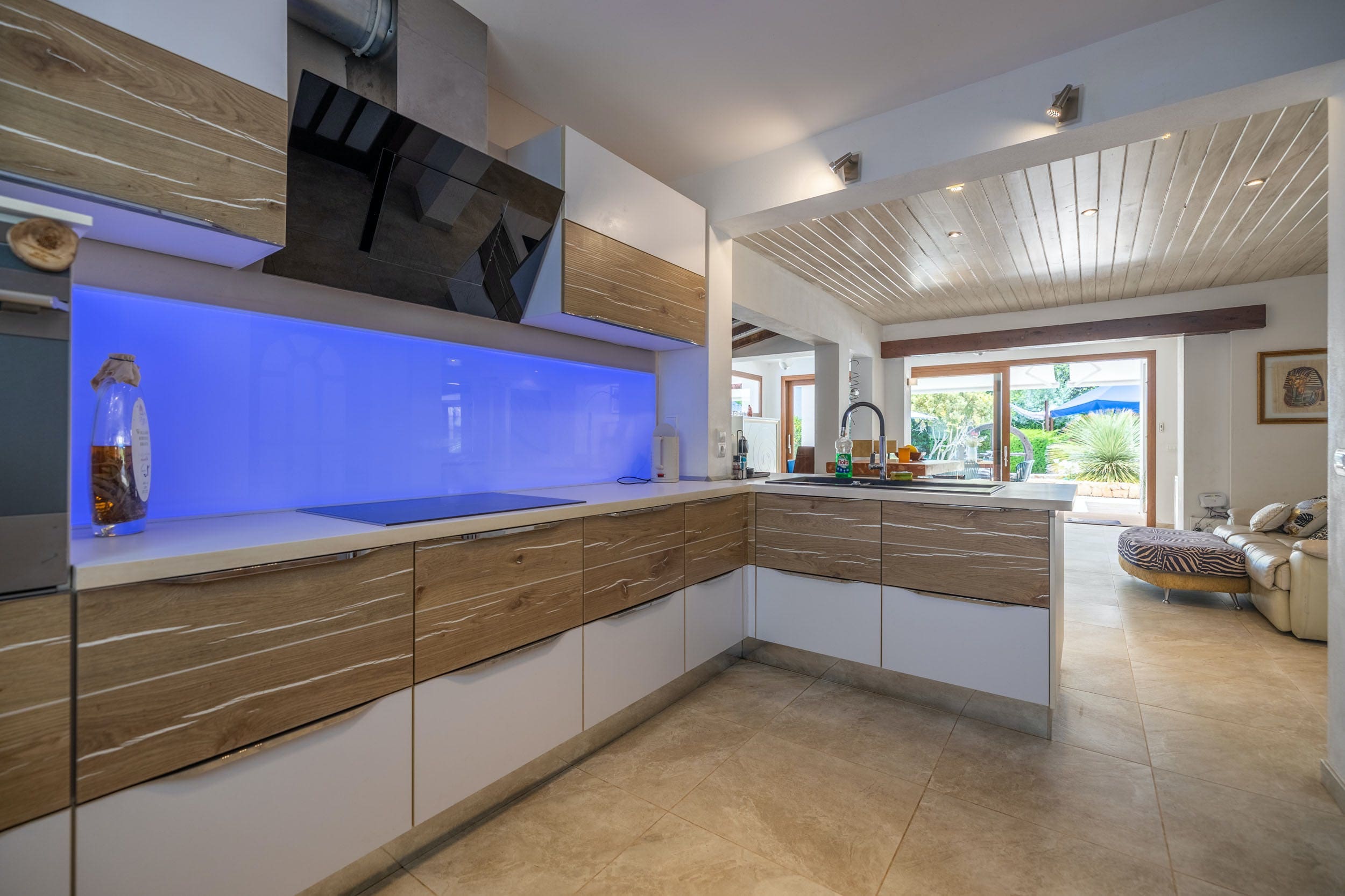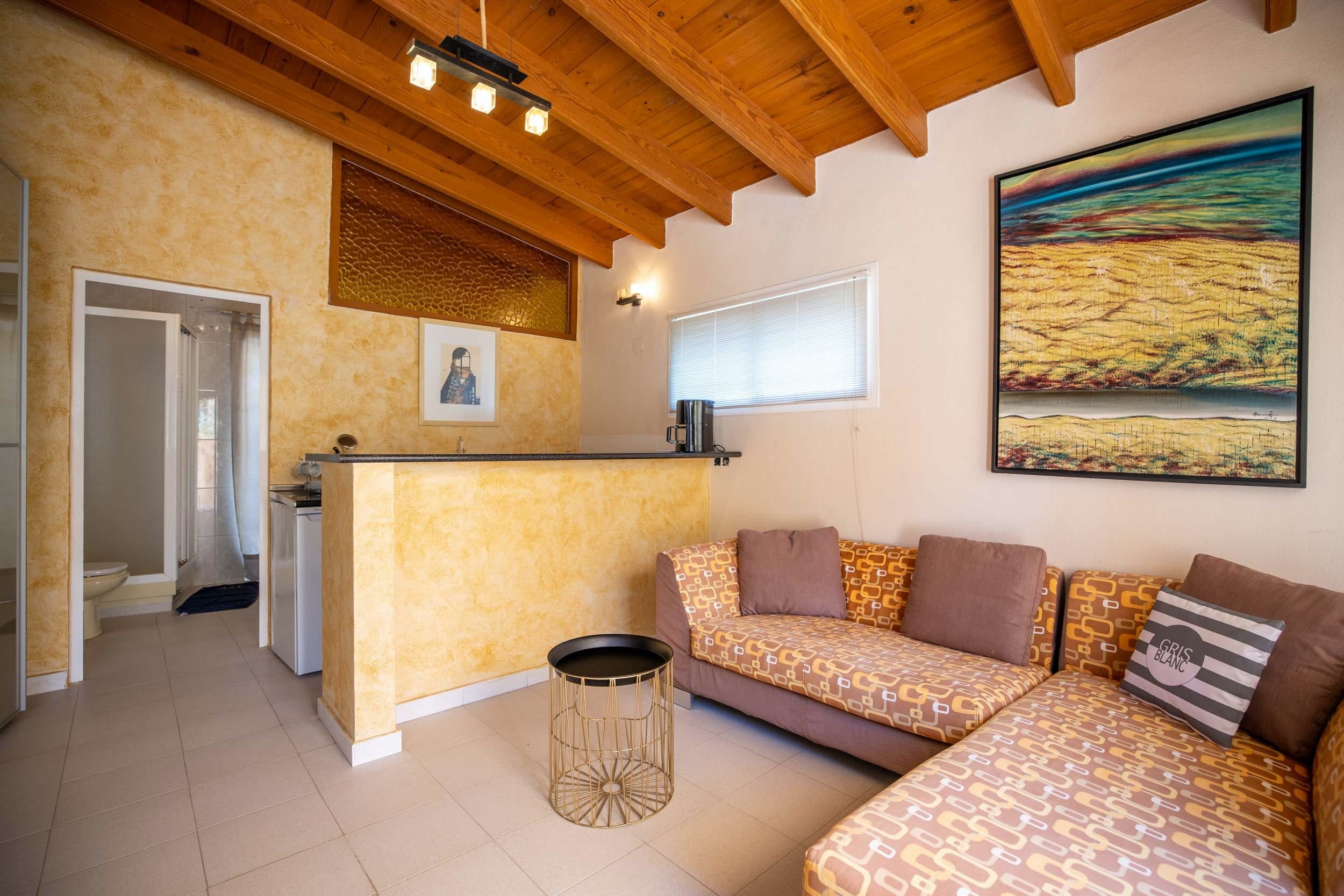 The interior of Casa Sabina Eulària is thoughtfully designed to accommodate up to 10 guests, ensuring that every family member or friend finds their own space. The villa is composed of two separate floors, each equipped with two bedrooms, a kitchen, and a living area. The additional standalone apartment provides a cozy retreat with its own bedroom, kitchenette, and bathroom, perfect for those desiring extra privacy. While the decor reflects a traditional style that might seem dated to some, the consistency in quality across all rooms ensures a comfortable stay.
