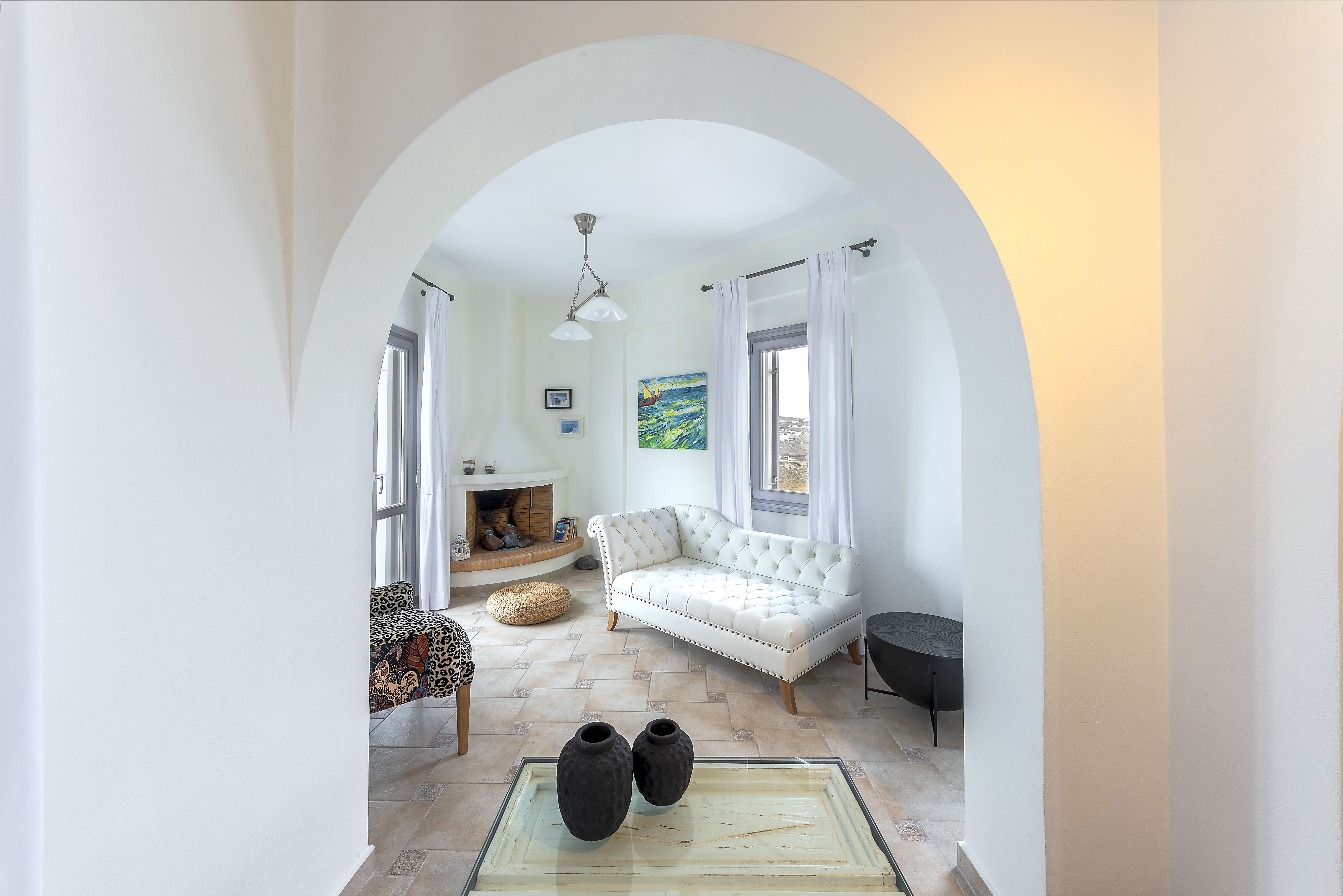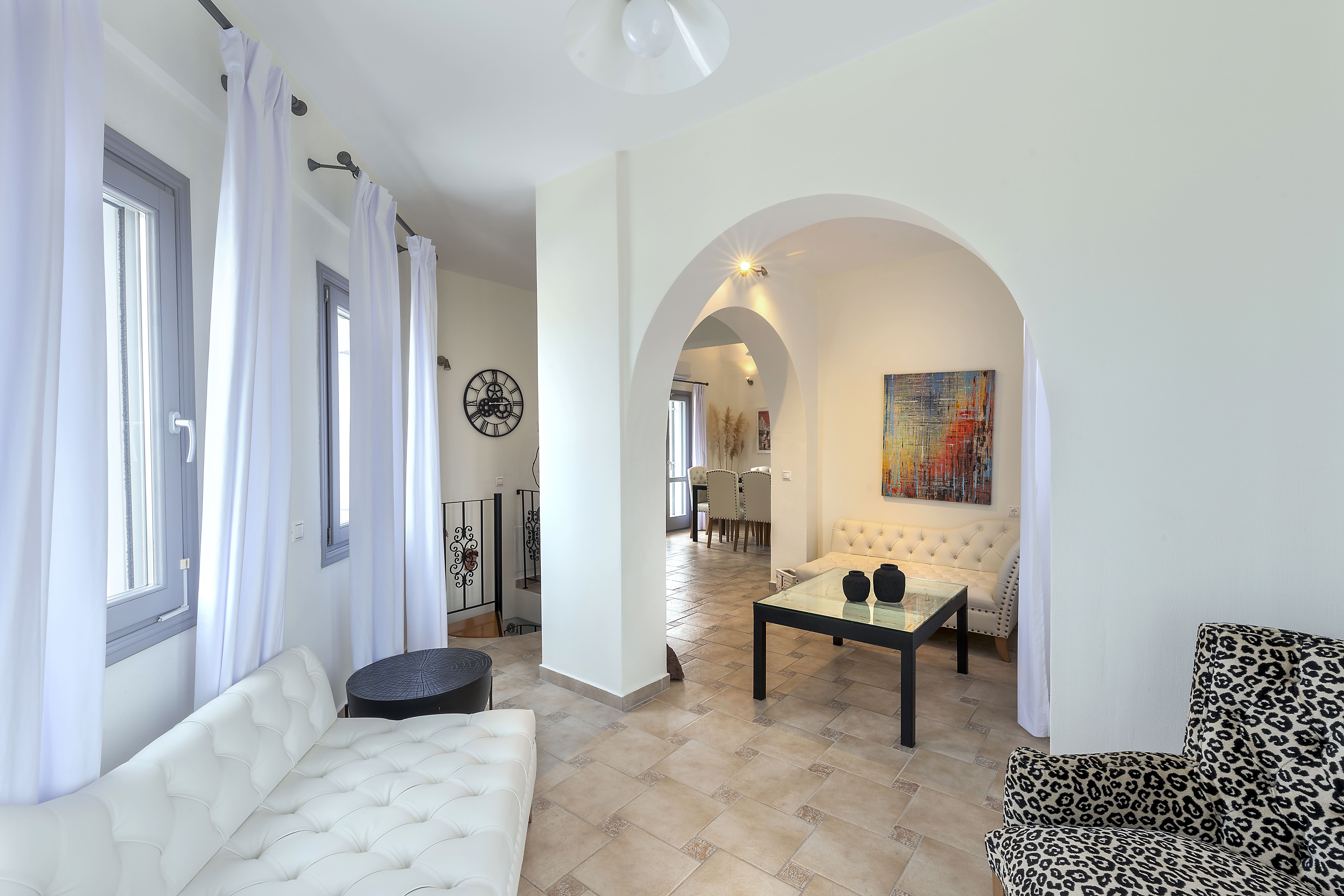 Step inside and be greeted by a harmonious blend of traditional Cycladic architecture and modern comforts. The ground floor hosts three tastefully decorated bedrooms, ensuring a restful night’s sleep. Upstairs, the open-plan kitchen, dining, and living areas are designed to maximize space and natural light, creating an ideal setting for relaxation and entertaining. The contemporary kitchen is fully equipped, making meal preparation a delight.