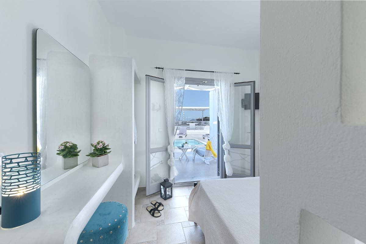Outside, the terrace offers a private oasis with a swimming pool and a hot tub, available from 8am to 8pm. Enjoy alfresco dining under a sheltered pergola, or unwind on comfy sun loungers while taking in panoramic views of the volcano and Oia. The vibrant hues of sunset over the Caldera provide a magical backdrop for any evening.