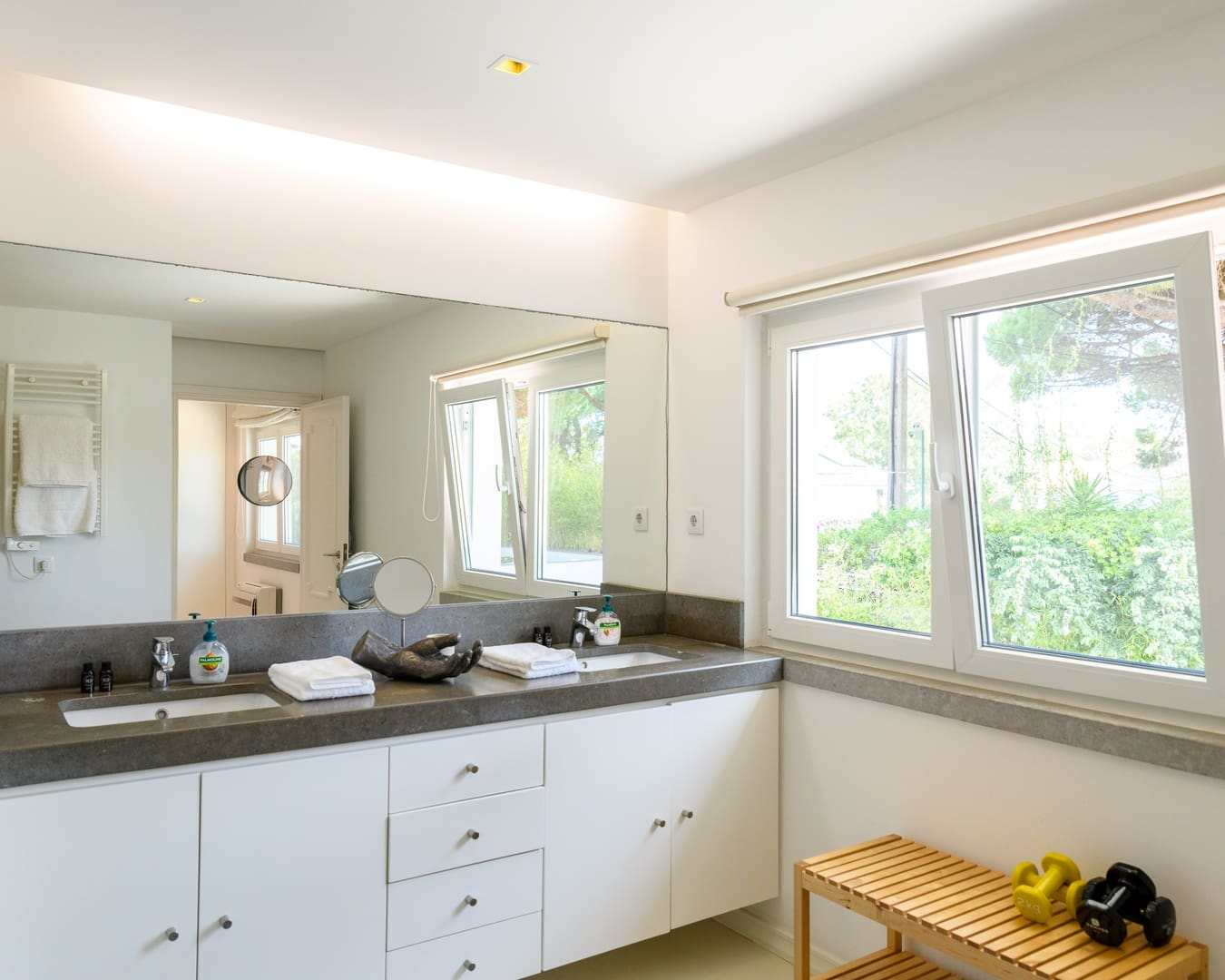 Step inside this expansive luxury villa rental in Cascais, where seven elegantly appointed bedrooms provide a serene retreat. The main suite is a standout, featuring its own private living room, perfect for unwinding in style. The spacious living areas are filled with natural light, complemented by tasteful art pieces that create an inviting ambiance. The modern kitchen is fully equipped, catering to all your culinary needs, whether you’re preparing a casual breakfast or a gourmet dinner.