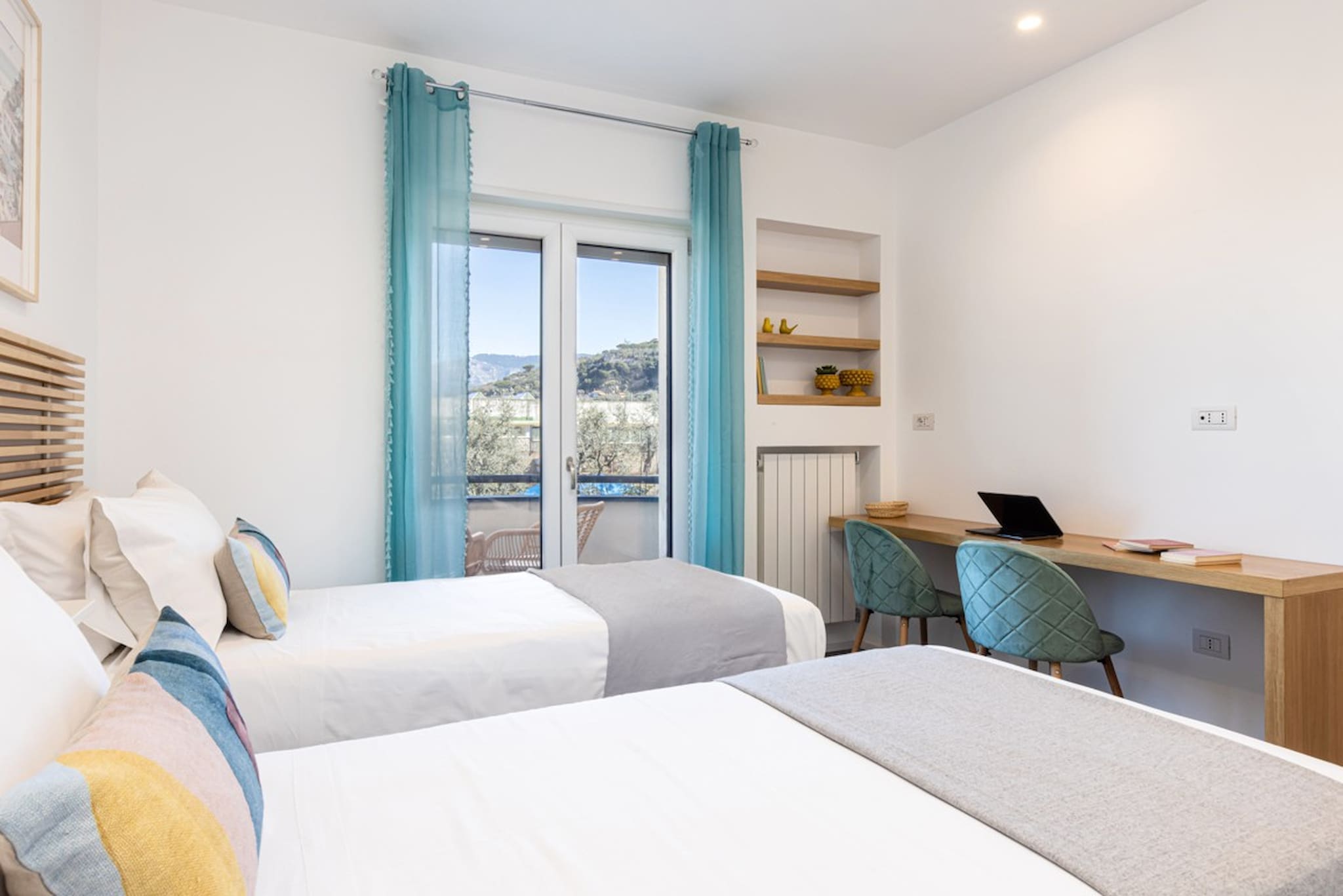 The apartment’s terrace offers sweeping views of the azure sea and the iconic silhouette of Mount Vesuvius, setting the scene for unforgettable alfresco dining experiences. The surrounding landscape, marked by lush greenery and the gentle breeze of the Gale wind, invites you to relax and soak in the beauty of the Amalfi Coast.