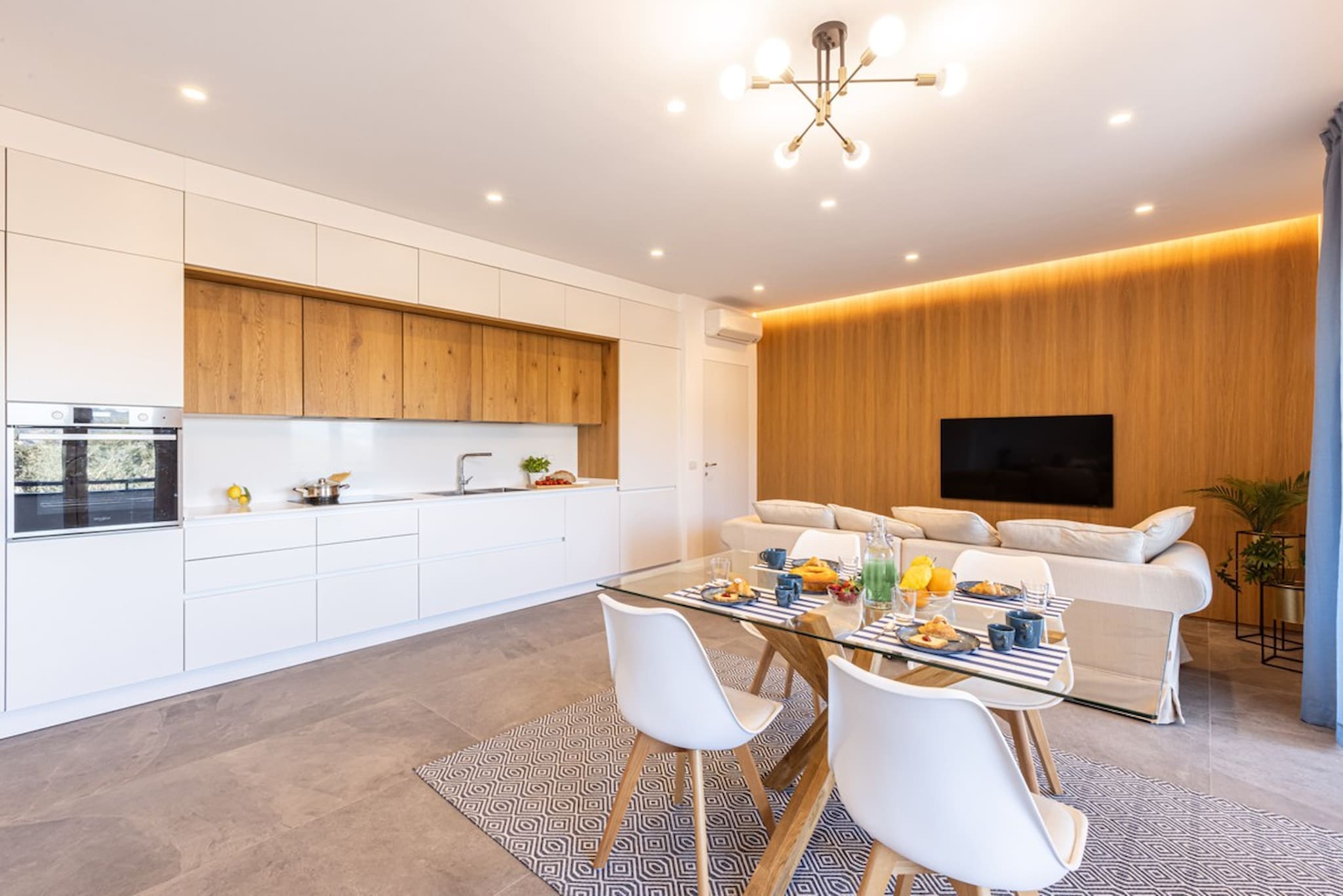 Step into a sunlit haven where contemporary design meets coastal charm. The spacious living area is perfect for family gatherings, boasting large windows that flood the space with natural light. A fully-equipped kitchen caters to your culinary adventures, while each of the three bedrooms grants access to a private terrace. The adaptable sleeping arrangements include a pair of single beds that can be converted into a queen-sized bed, ensuring versatility for families and friends alike.