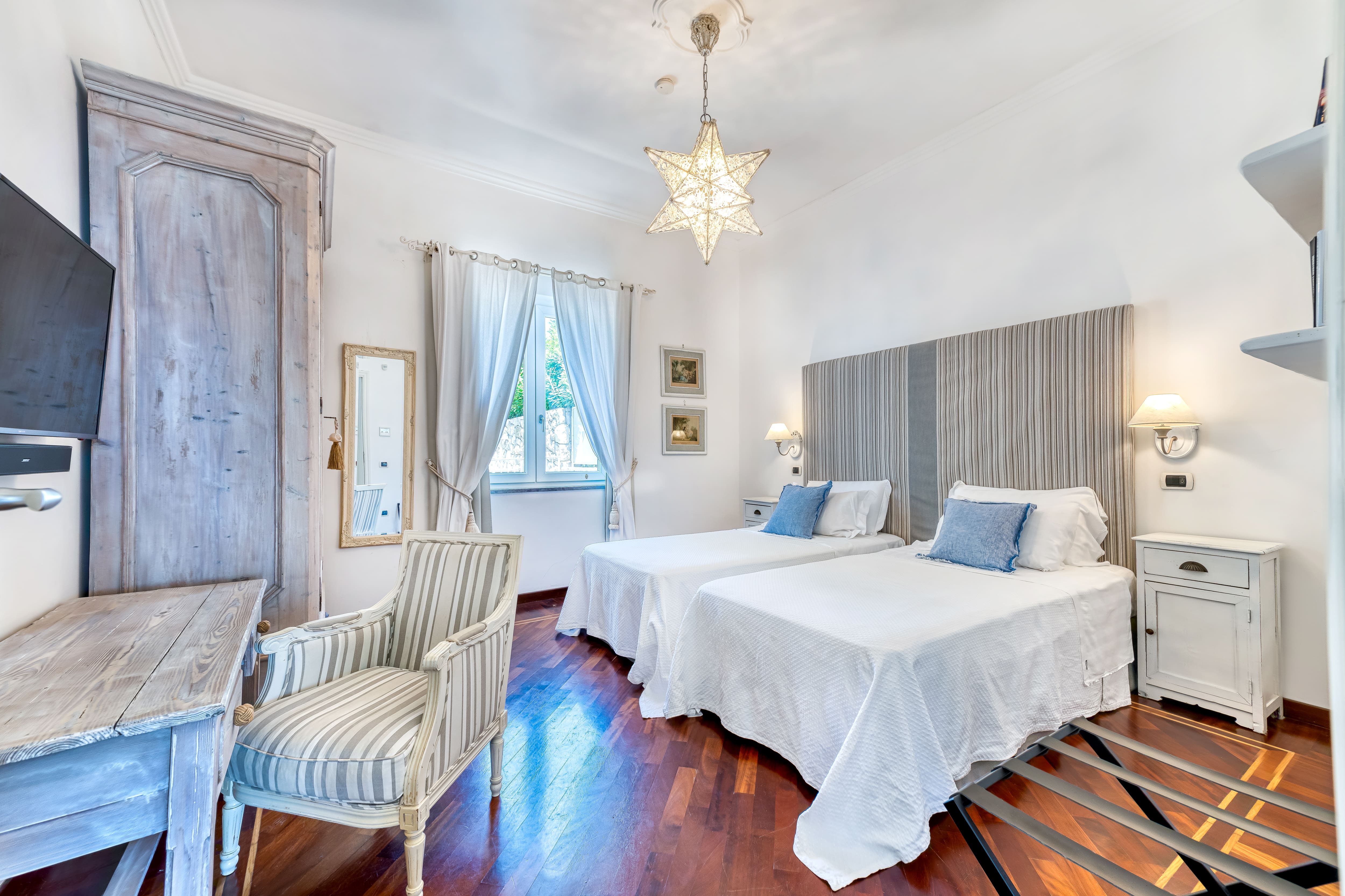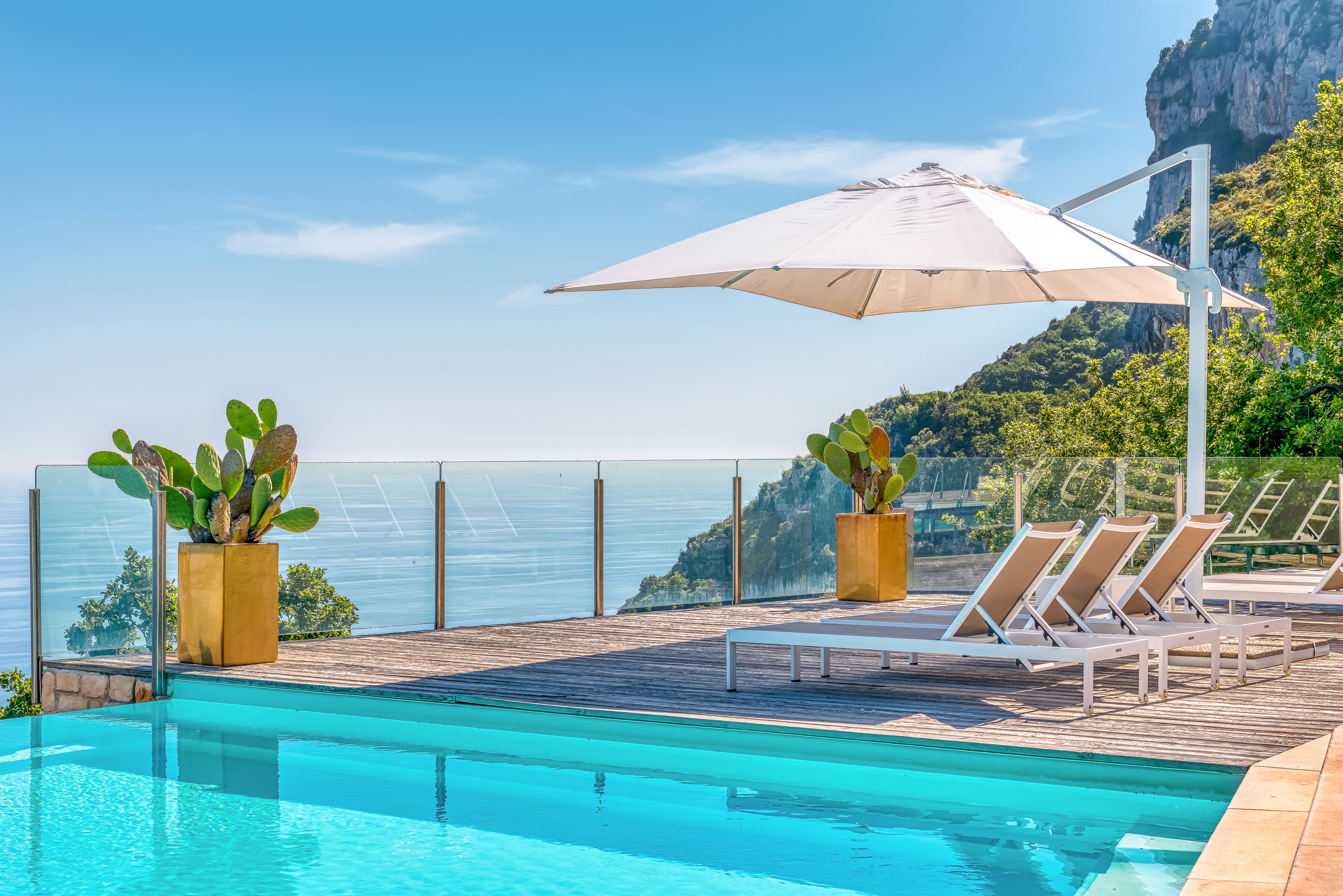 Outside, the apartment’s terraces offer sweeping seaviews of the Amalfi Coast, providing an idyllic backdrop for morning coffees or sunset cocktails. The private heated pool and hot tub invite you to unwind in style, while the alfresco dining space is perfect for memorable meals under the stars. With a beach nearby, the coastal charm of Sorrento is always within reach.