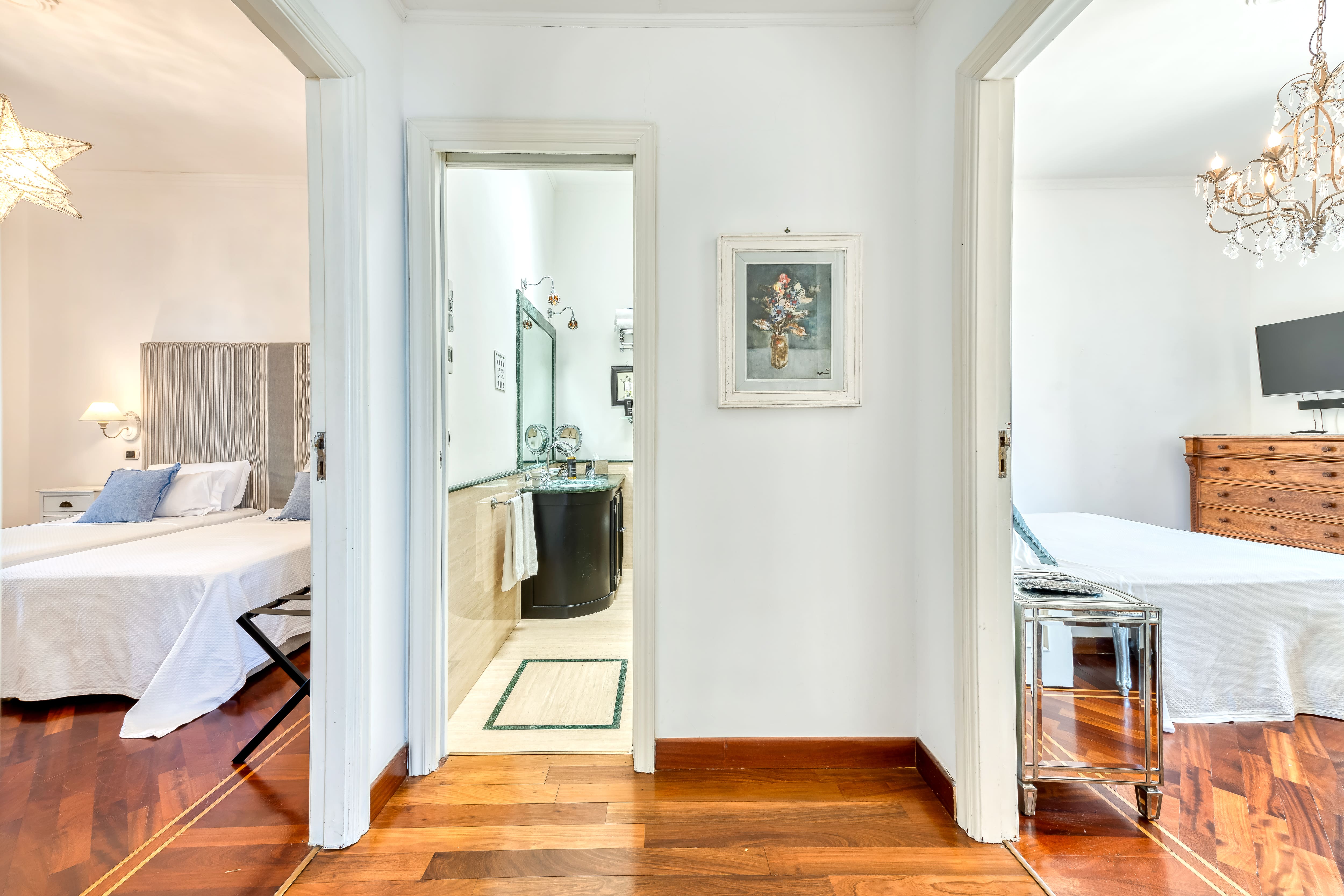 Step into a world of sophistication as you enter this stunning apartment. The interior is thoughtfully designed with modern elegance, featuring open-plan living spaces that are perfect for both relaxation and entertainment. With four spacious bedrooms and three luxurious bathrooms, this apartment comfortably accommodates up to eight guests. Each bedroom is a sanctuary of comfort, offering plush bedding and serene decor. The fully equipped kitchen is a culinary delight, ideal for crafting delicious Italian meals.