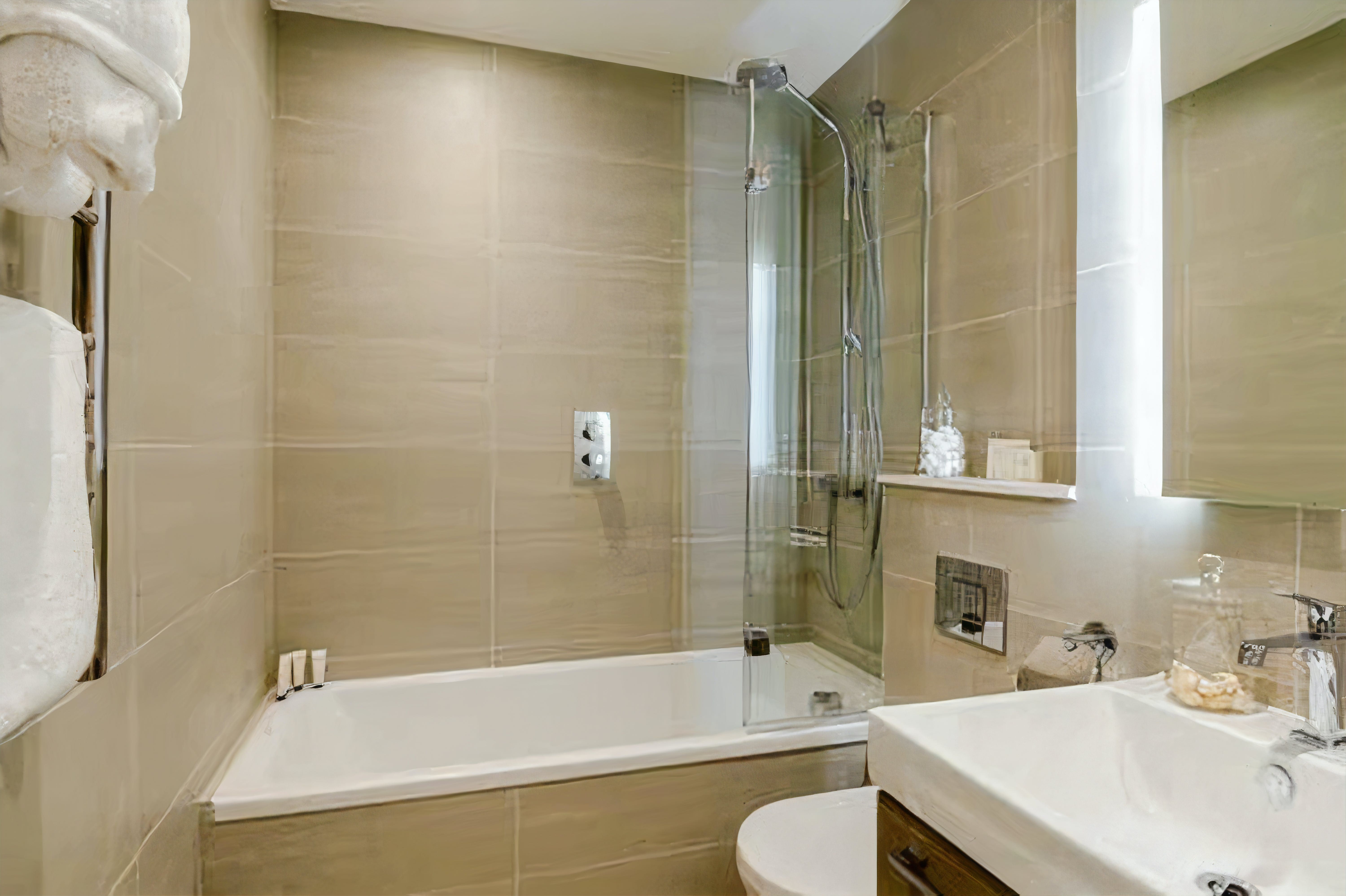 This 2-bedroom, 2-bathroom apartment showcases a refined interior marked by contemporary design and comfort. The spacious living area invites relaxation, featuring plush seating and a flat-screen TV for cozy movie nights. The kitchen is fully equipped, offering everything from modern appliances to ample counter space for culinary adventures. Each bedroom promises restful slumber with luxurious bedding, while the bathrooms provide a spa-like retreat after a day of exploring the city.