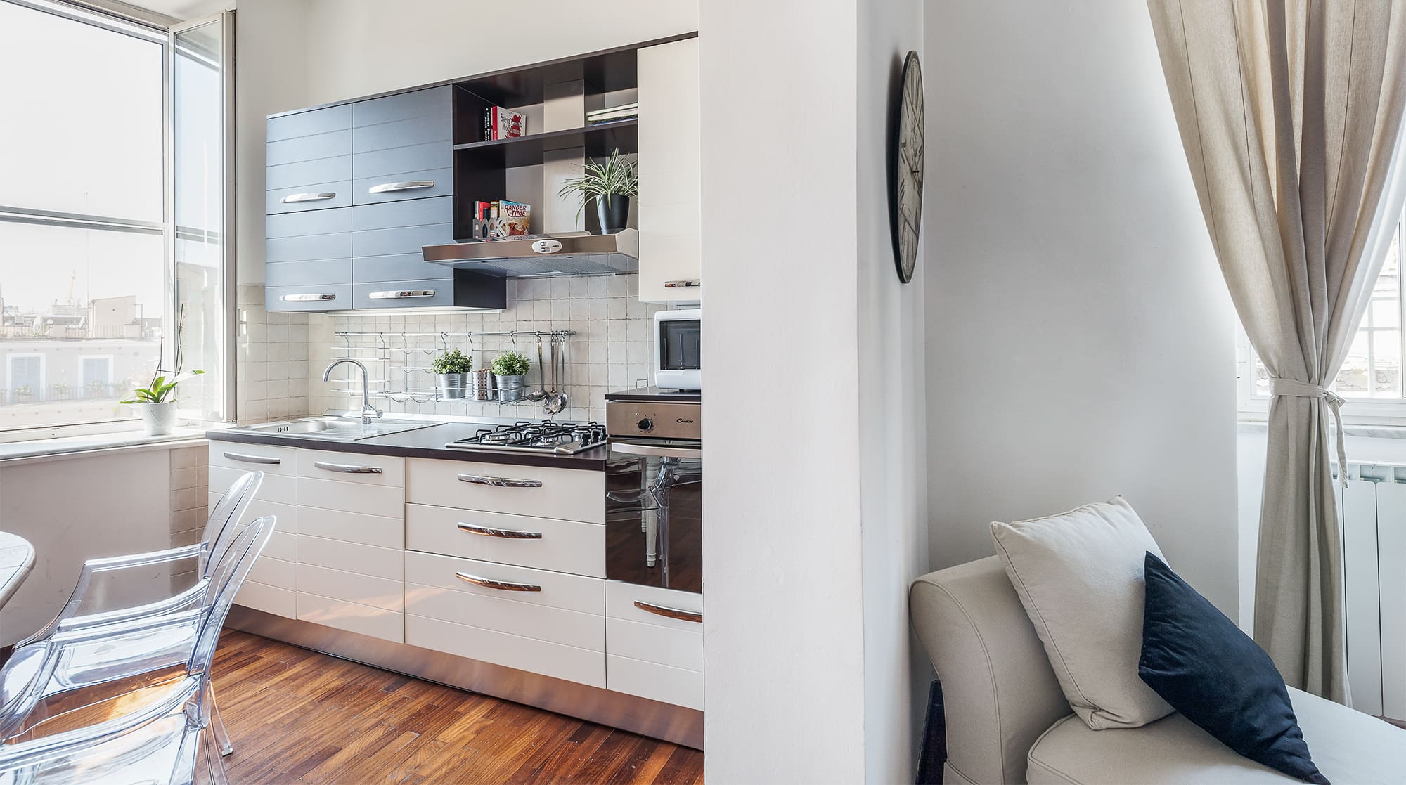 Step inside and be greeted by a colorful array of art and eclectic furnishings that define this apartment’s unique character. The living area features a Chesterfield-style sofa and see-through dining chairs, creating a perfect mix of modern and classic styles. Large windows flood the space with natural light, offering views over Rome’s charming rooftops. The master bedroom is a sanctuary of its own, complete with a private balcony where morning coffees are accompanied by the lively street below. The sleek kitchen, though compact, is fully equipped to cater to your culinary needs.