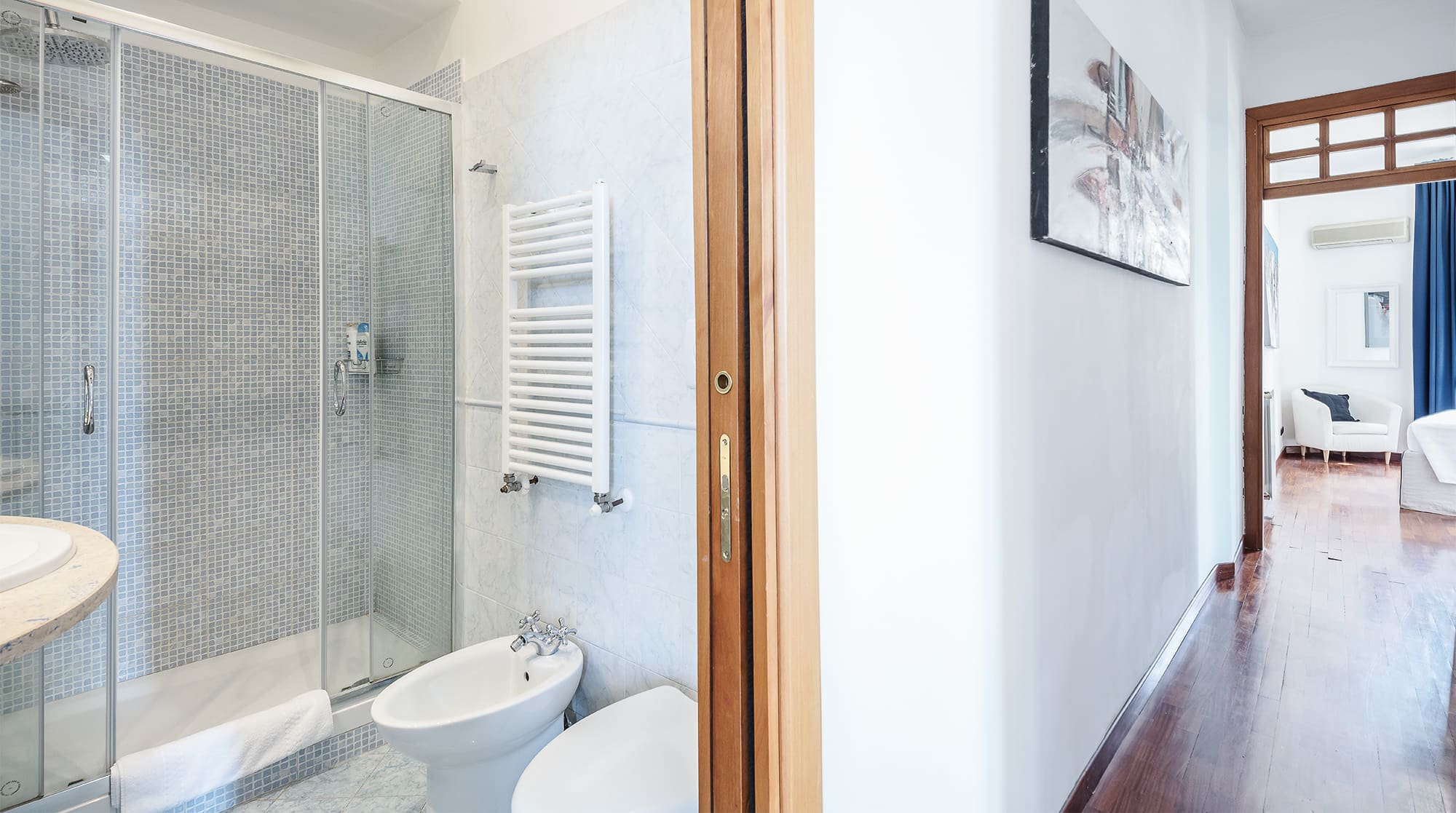 The focal point of this apartment is undoubtedly the master bedroom’s balcony, a serene spot for enjoying an aperitif while watching the city come alive. While the building’s lift only reaches the fourth floor, the short climb to the fifth rewards you with a panoramic view of the Vatican and the signature Roman skyline. Paid parking is available, but with Rome’s enchanting streets at your doorstep, exploring on foot is recommended.