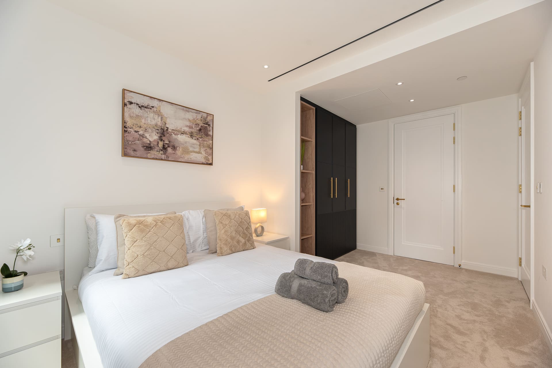 Step inside this elegantly appointed apartment and be greeted by an open-plan living space that exudes modern charm. The interior boasts high-end finishes and a stylish design aesthetic, ensuring a comfortable and memorable stay. The living area features plush seating, including two sofa beds, accommodating up to eight guests. The fully equipped kitchen offers everything needed to prepare a gourmet meal, while the two spacious bedrooms provide a serene retreat after a day of exploring London. Each bedroom is complemented by a contemporary en-suite bathroom, enhancing the overall sense of luxury.