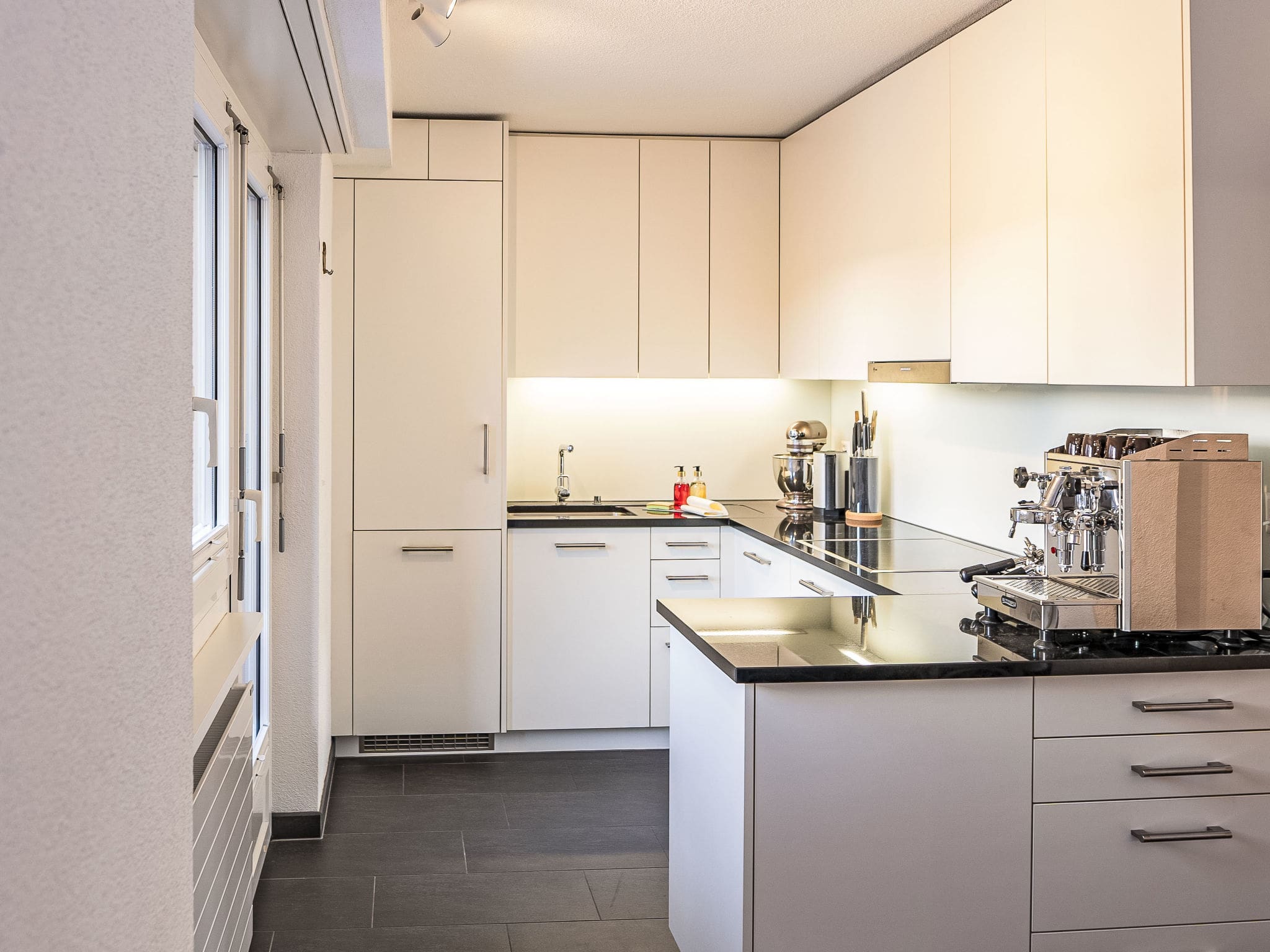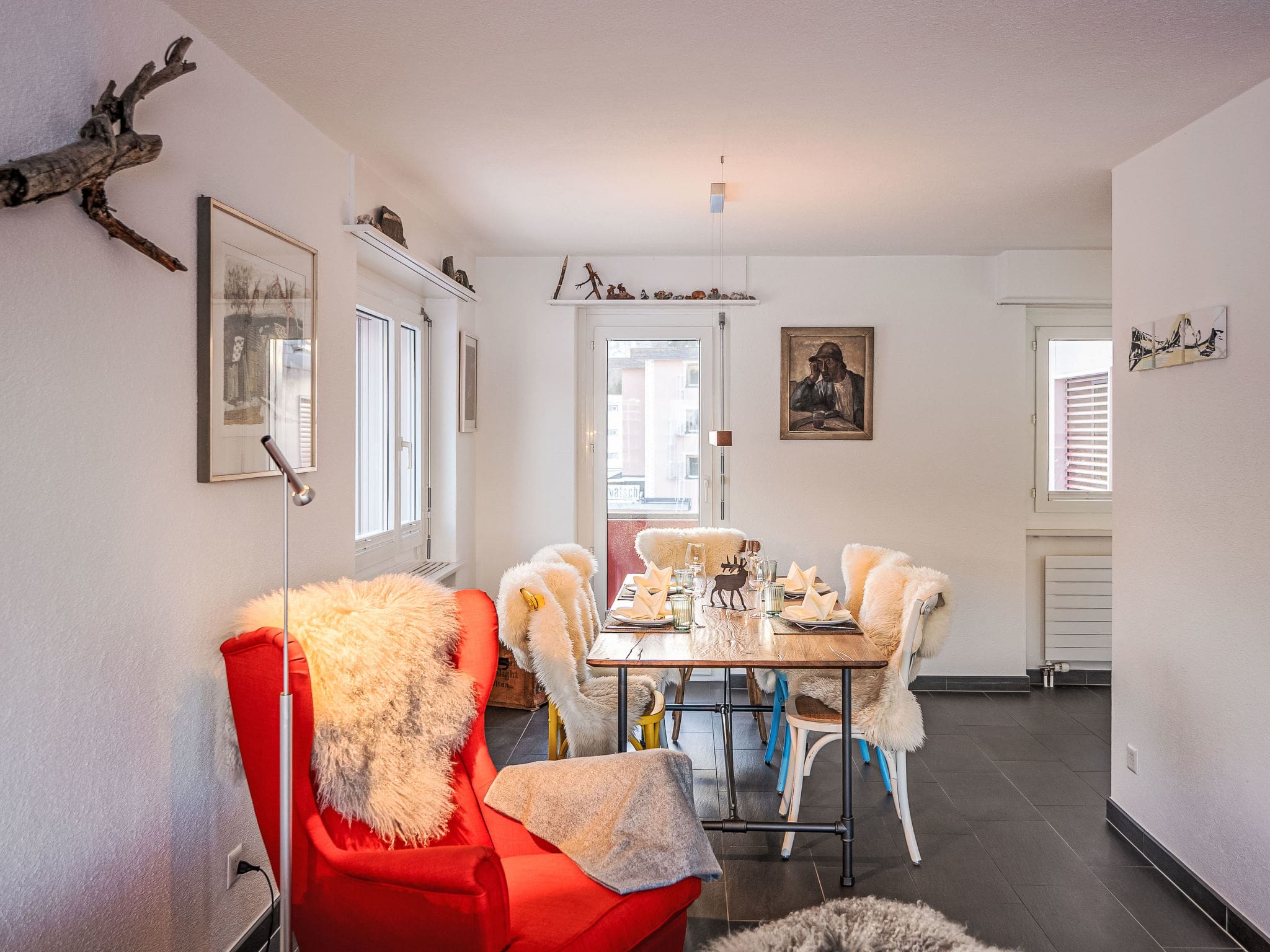 The apartment’s twin balconies present a spectacular outdoor experience, with the west-facing terrace perfect for evening aperitifs as the sun sets behind towering peaks, while the east-facing balcony captures morning light dancing across Lake St. Moritz. Both spaces feature comfortable outdoor furniture ideal for al fresco dining using the apartment’s raclette grill and fondue sets. The building provides convenient elevator access and dedicated parking for two vehicles, essential for exploring the broader Engadin region or arriving with ski equipment during winter months.