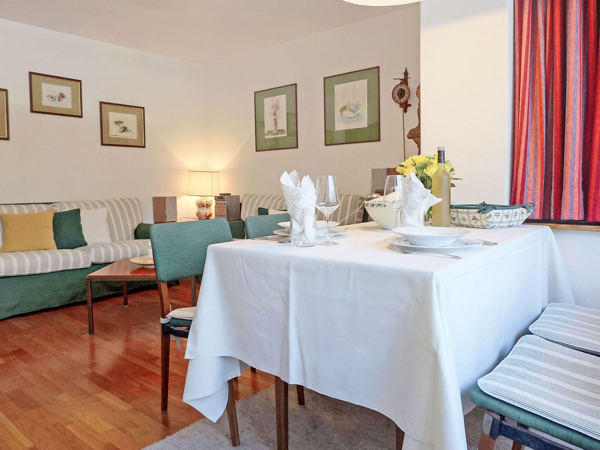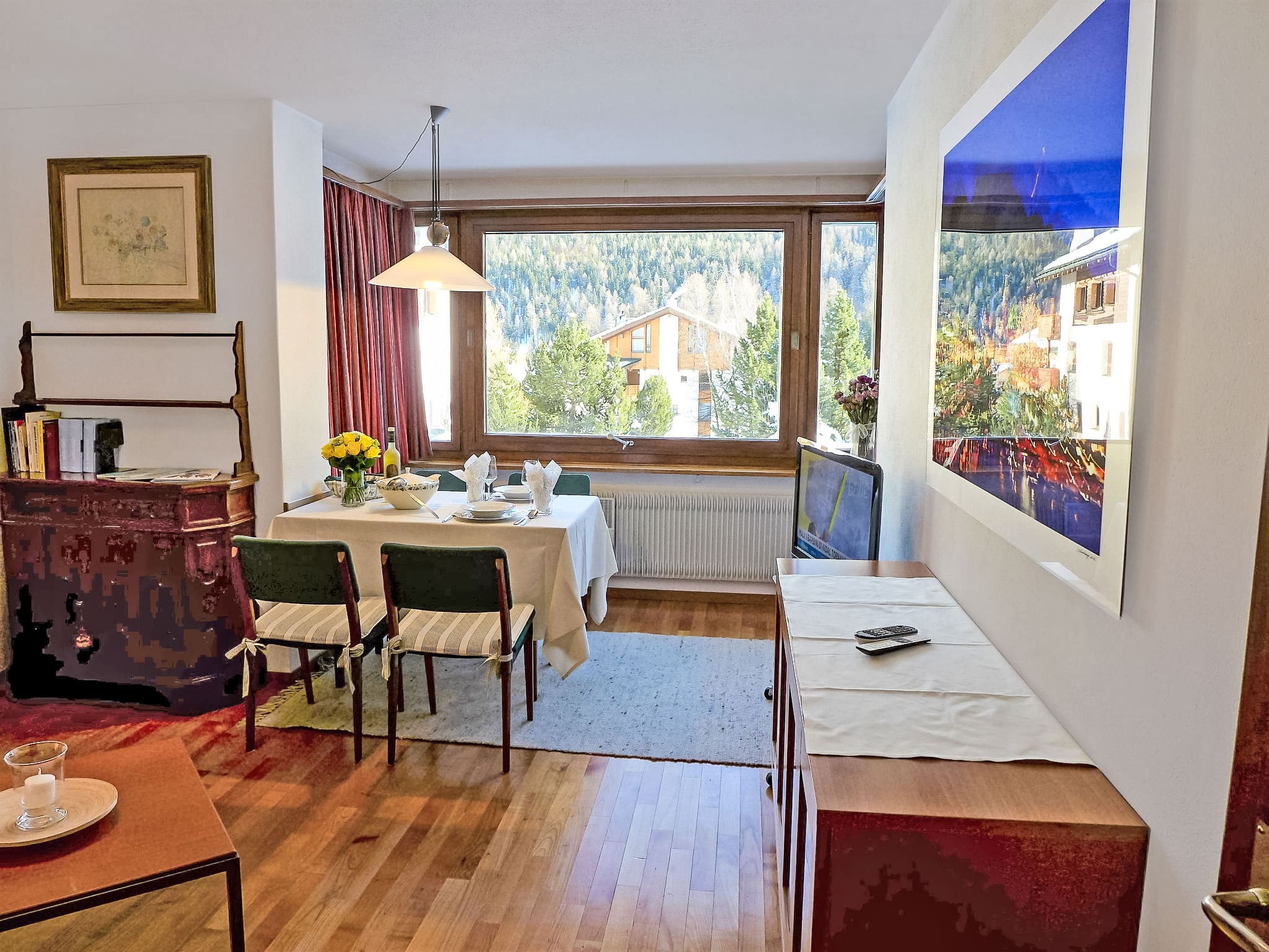 While the apartment doesn’t feature private outdoor space beyond the balcony, the elevated position within the residential district provides excellent access to St. Moritz’s stunning natural environment. The property sits just 800 metres from the pristine Lake St. Moritz, where summer visitors can enjoy sailing, surfing lessons, or simply relaxing by the crystal-clear waters. The apartment’s sunny position ensures excellent natural light throughout the day, while the balcony furniture creates a comfortable outdoor dining area with those incredible mountain views as a backdrop.