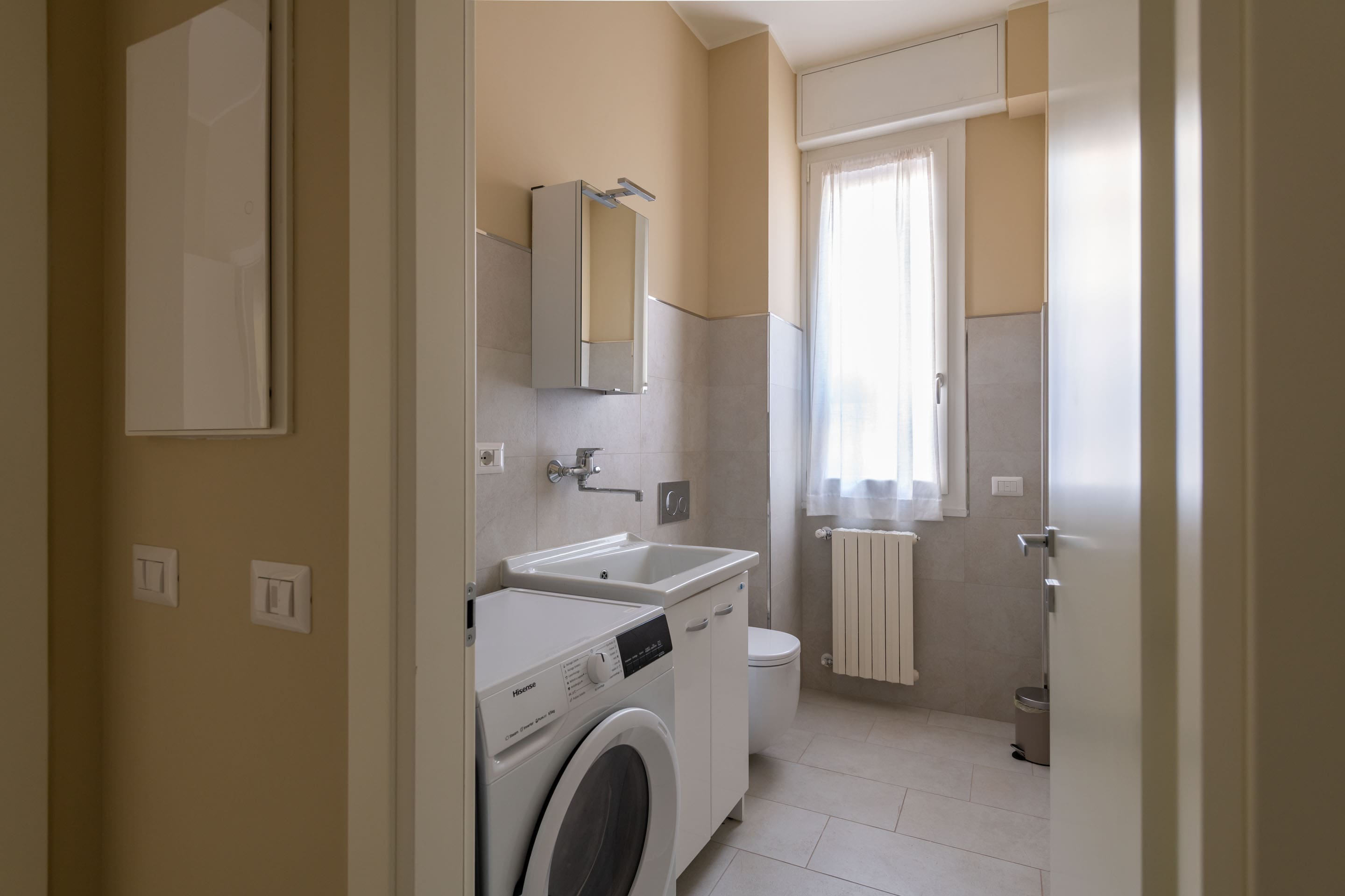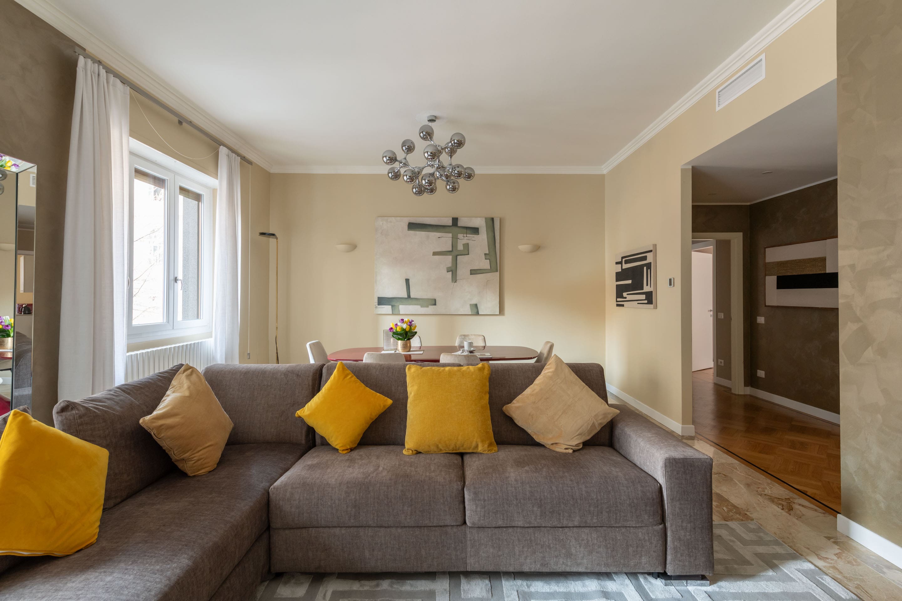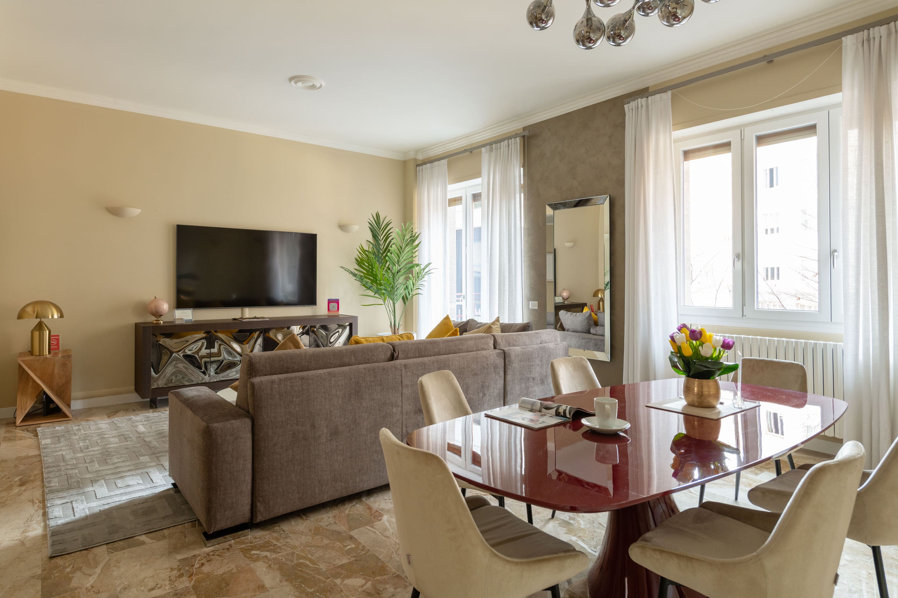 The interior of this luxury apartment rental in Milan is a testament to sophistication and comfort. The open-plan living and dining area serves as the heart of the home, providing a welcoming space to unwind after a day of sightseeing. The well-equipped kitchen is perfect for those who love to cook, featuring modern appliances and ample space. Each of the two bedrooms is designed with tranquility in mind, offering plush bedding and serene decor to ensure a restful night’s sleep. The two bathrooms, elegantly appointed, offer a refreshing start or end to your day.