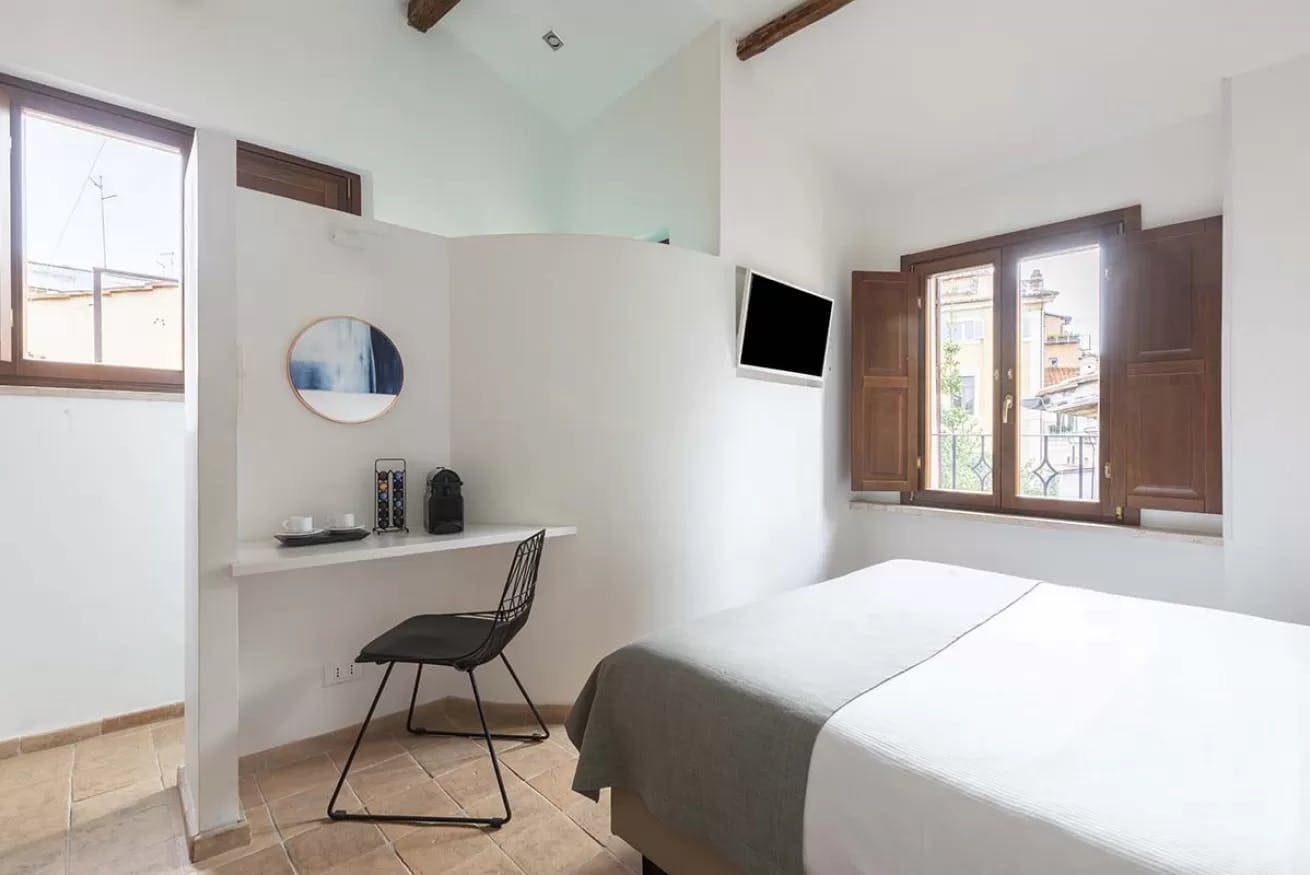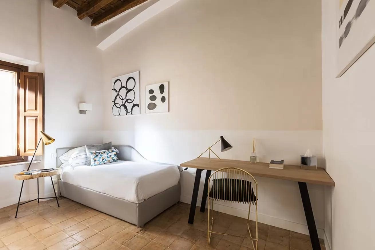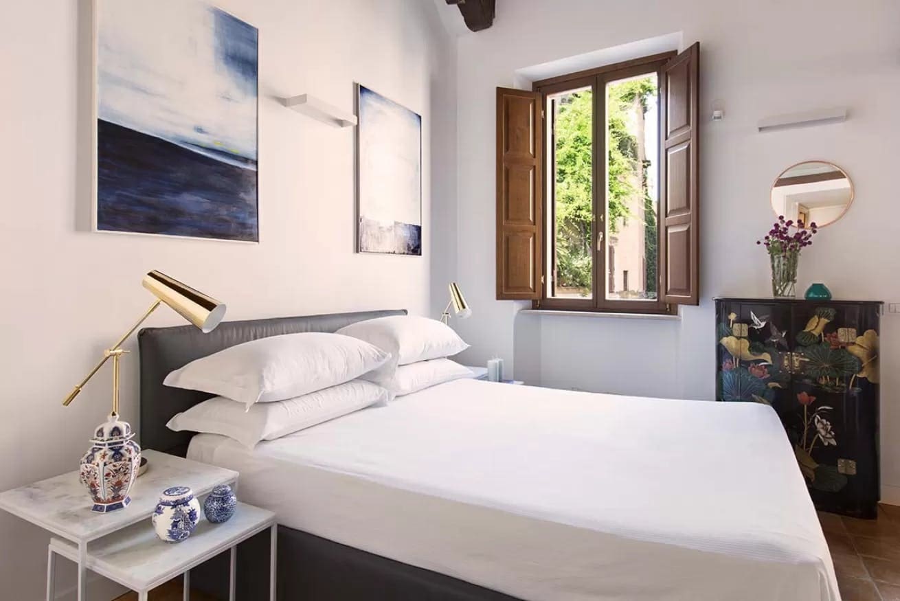 While the apartment’s interiors are truly stunning, the outdoor spaces offer an equally captivating experience. A large terrace provides an ideal spot for al fresco dining or simply unwinding with a glass of wine. The surrounding views of Rome’s historic architecture add a breathtaking backdrop to your stay. Although centrally located, this apartment offers a sense of seclusion akin to a countryside retreat.