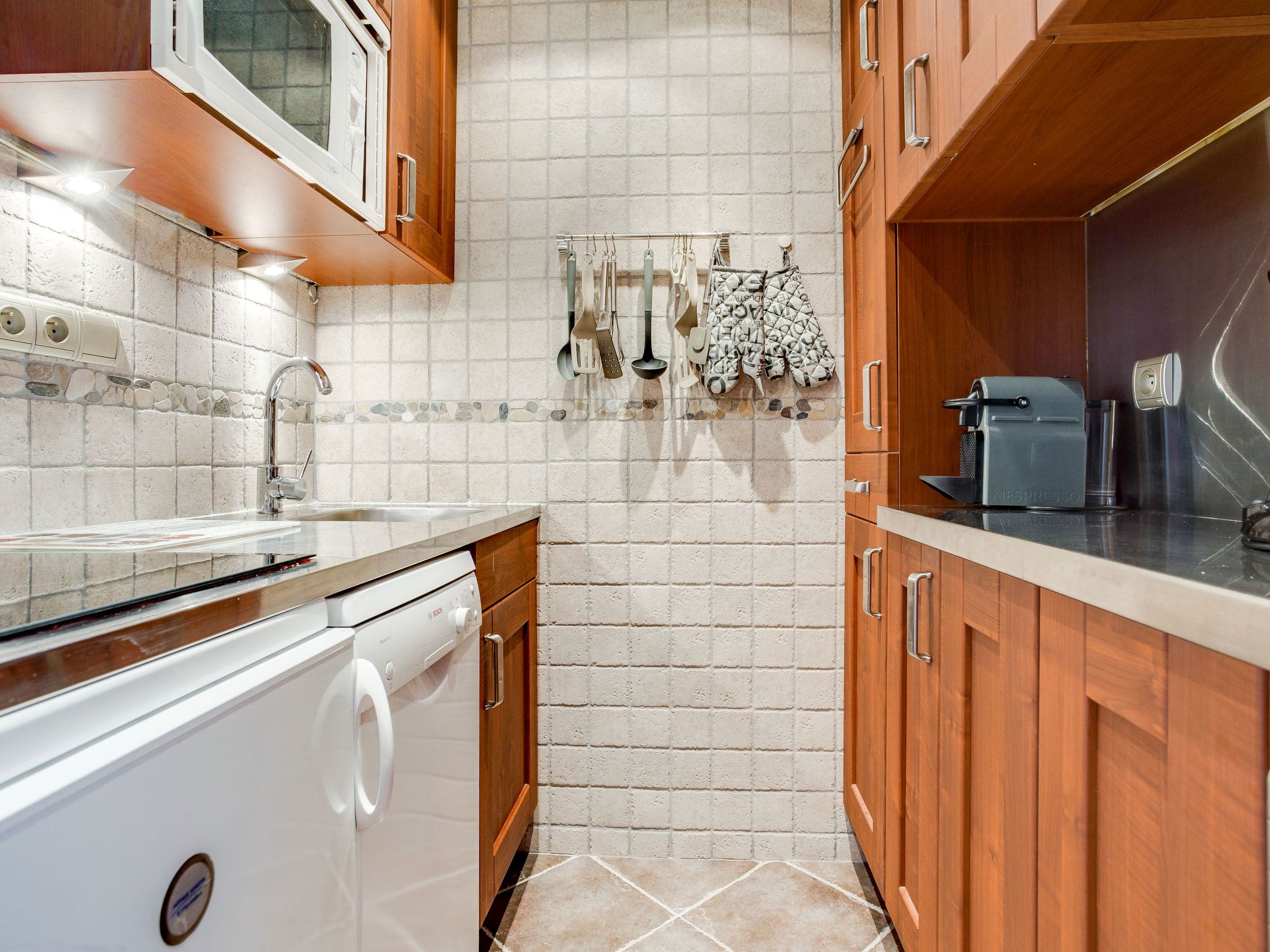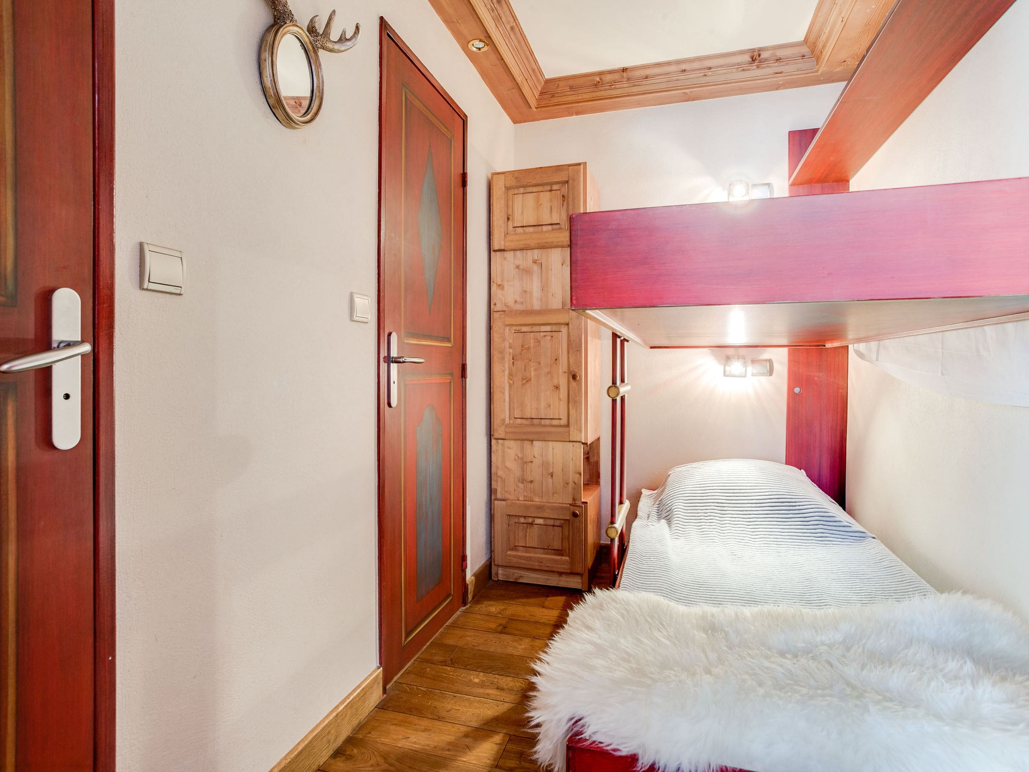 The master bedroom offers a luxurious French bed and its own television, with direct balcony access to enjoy those crisp mountain mornings. A sleeping alcove with custom bunk beds provides additional accommodation, while the compact yet fully equipped kitchen includes modern conveniences including a dishwasher, ceramic hob, microwave, and Nespresso coffee machine. The bathroom features a relaxing bathtub, perfect for unwinding after days on the slopes.
