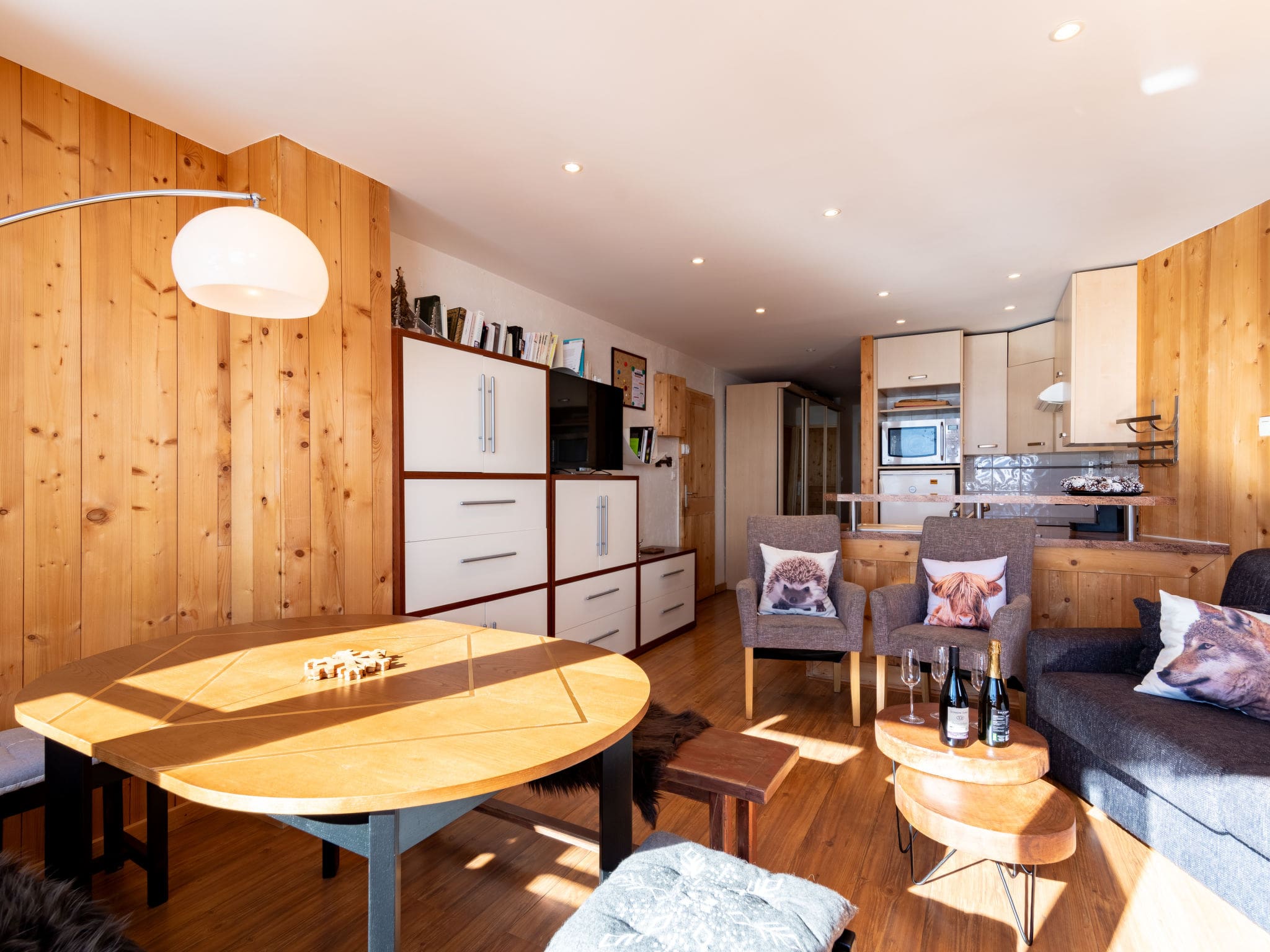 This elegant three-room apartment has been completely renovated to blend cosy alpine charm with modern convenience. The open-plan living and dining area features a comfortable sofabed and flat-screen television, with French doors leading to a south-facing balcony where you can savour morning coffee while taking in spectacular mountain vistas. The master bedroom offers a luxurious French bed and en-suite shower room with its own flat-screen TV, plus private balcony access for those magical sunrise moments over the peaks.