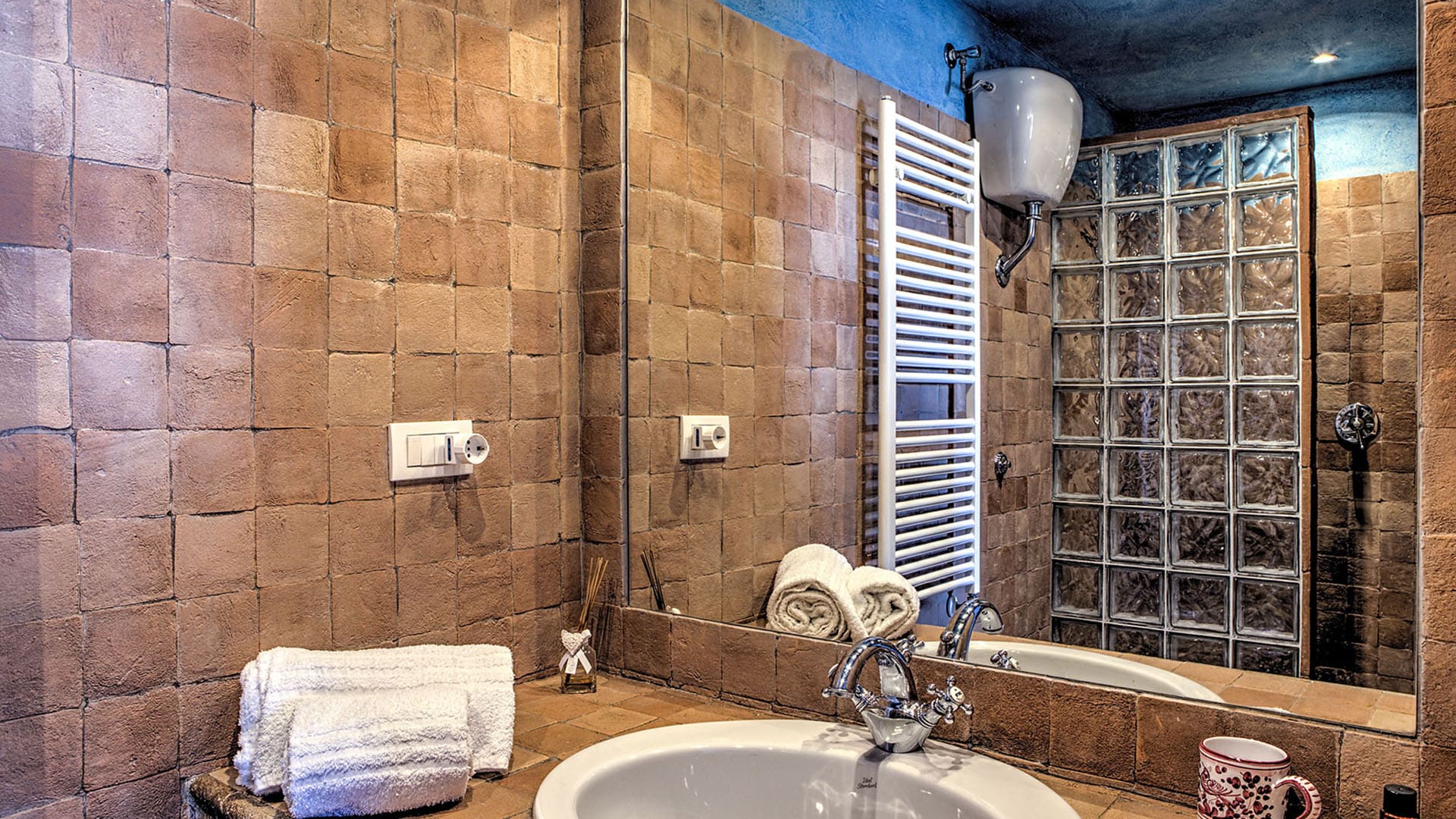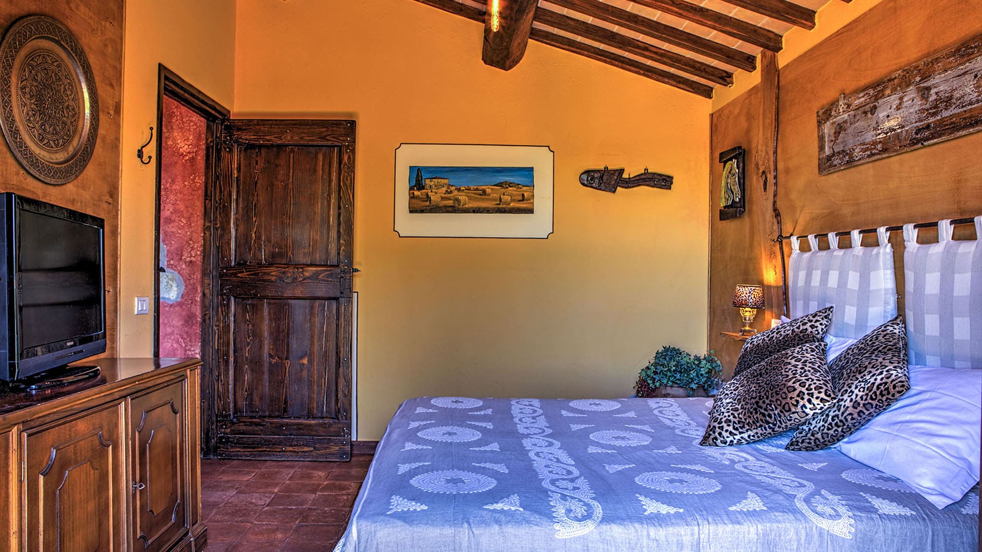 Step into a world of rustic elegance as you explore the interiors of Palazzo Pietra. The apartment showcases traditional Umbrian architecture with wooden beams and an ornate wood burner that serves as the living room’s focal point. The spacious living areas provide ample room for relaxation and entertainment, while the modern kitchen is fully equipped for preparing delightful meals. Each of the five bedrooms offers air-conditioned comfort and picturesque views, ensuring a restful night’s sleep for all guests.