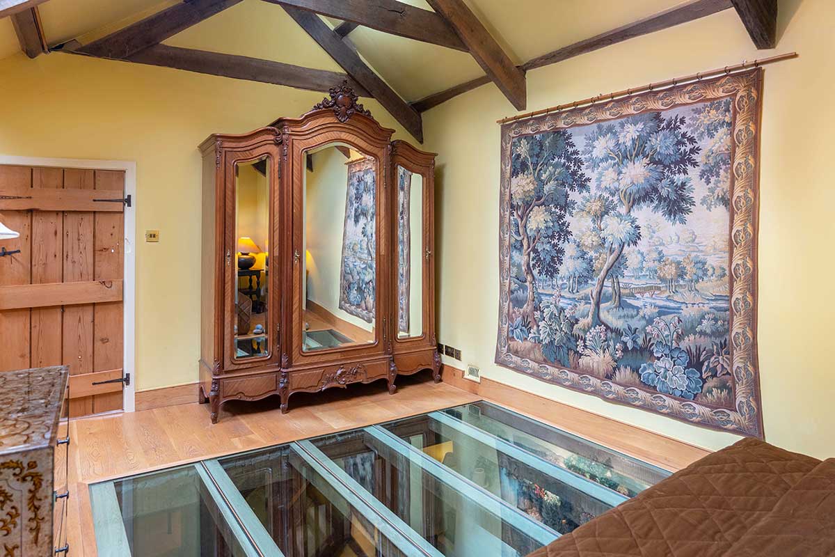A: Yes, the master bedroom features a unique glass floor offering a view into the living area.