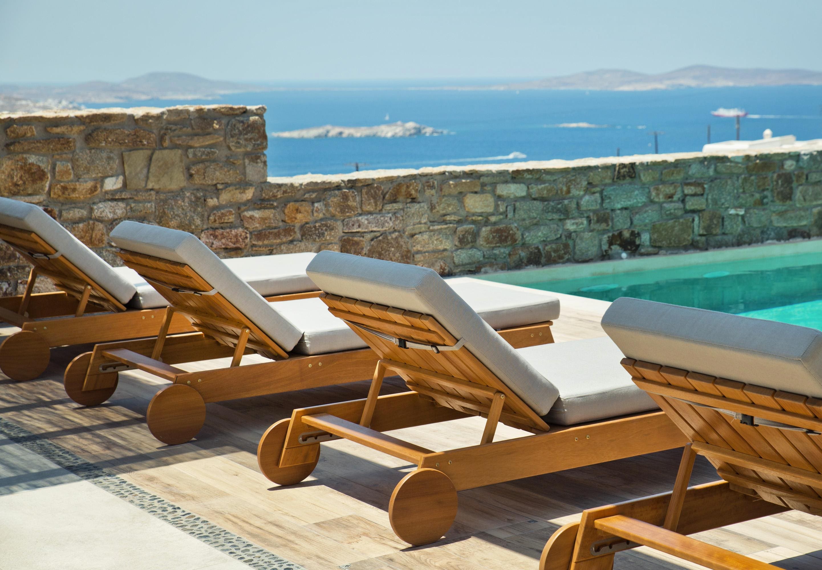 The outdoor areas are designed for relaxation and enjoyment, featuring a stunning L-shaped pool with an infinity edge that seems to merge with the sea beyond. Multiple terraces and seating nooks provide the perfect vantage points for soaking in the panoramic views of the Aegean and the nearby island of Rineia. Whether you’re dining al fresco or lounging with a good book, the serene outdoor spaces enhance the tranquil ambiance of this Mykonos gem.