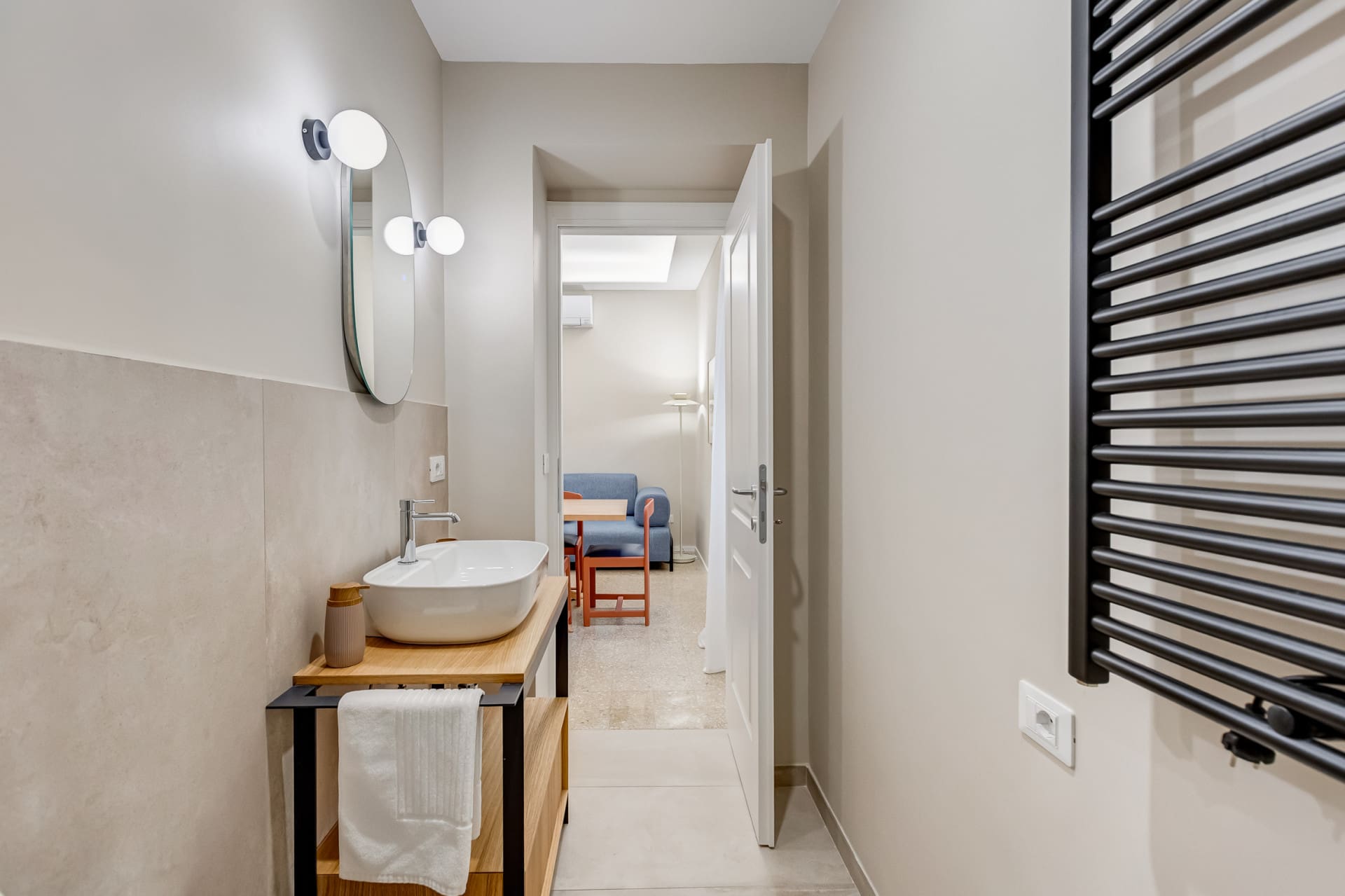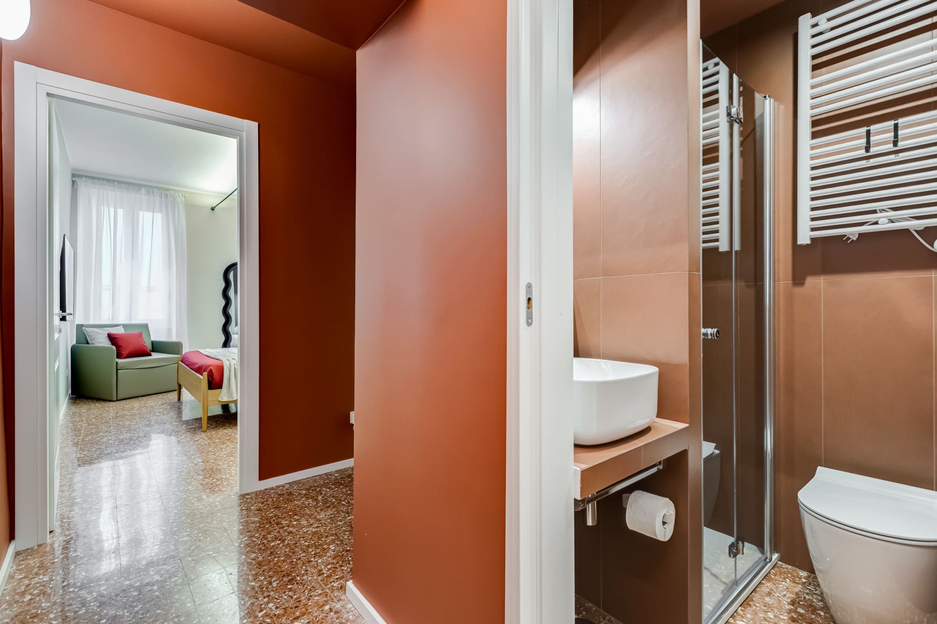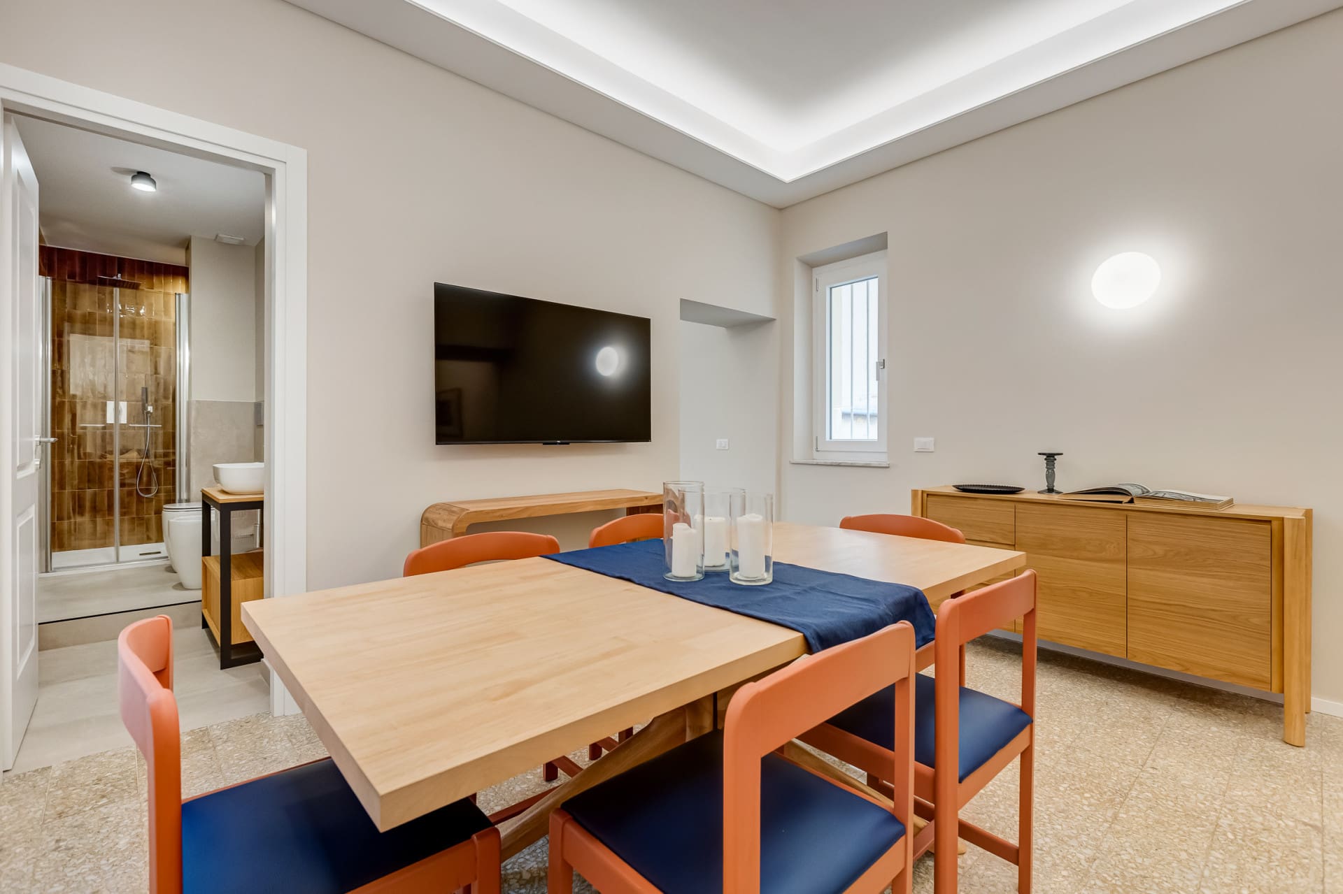 Step inside and be greeted by a spacious and welcoming interior, where traditional Italian design meets contemporary flair. The apartment boasts three elegantly appointed bedrooms, each with its own bathroom, ensuring privacy and convenience for all guests. The living area is bright and airy, perfect for relaxing after a day of exploring. While the kitchen is equipped with a hob and microwave, it’s designed for preparing light meals and snacks, ideal for those who prefer to sample the local cuisine. A single sofa bed in one bedroom offers additional sleeping space, accommodating up to seven guests comfortably.