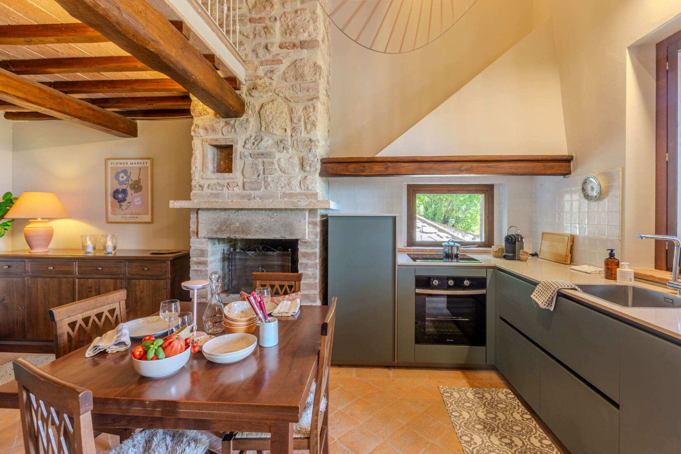 The interior of this luxury apartment rental in Umbria is a harmonious blend of traditional Italian charm and modern convenience. The main house features three beautifully appointed bedrooms, each designed with comfort and style in mind. An additional en-suite bedroom in a separate annexe provides privacy and space for larger groups. The living area is a welcoming space with plush seating and elegant decor, while the kitchen is fully equipped, ideal for preparing delightful meals with local ingredients. Each room is an invitation to relax and unwind in luxury.