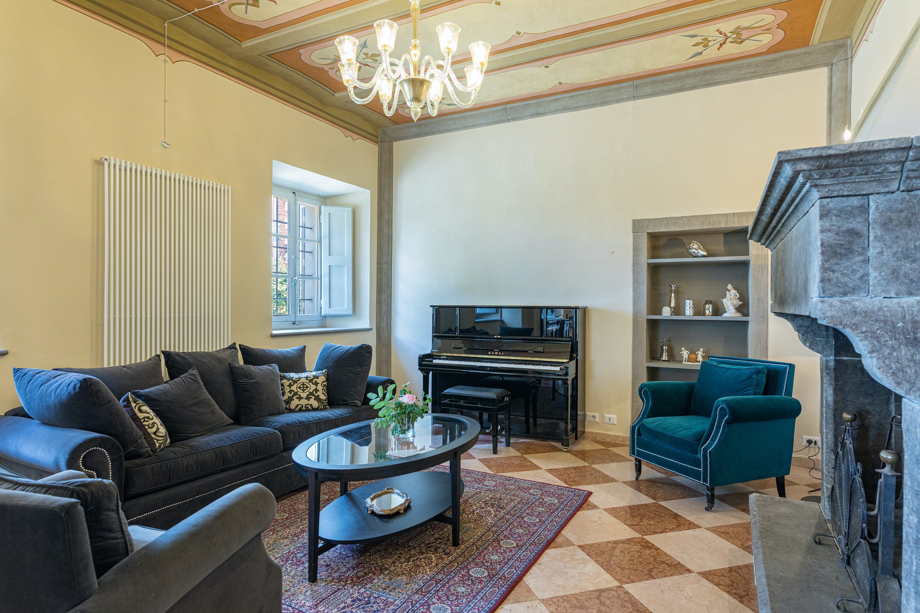 The interior of this luxury apartment in Tuscany is a seamless blend of classic and contemporary styles. Each of the twelve bedrooms is equipped with air conditioning, ensuring a comfortable stay. The apartments boast individual living areas, ranging from grand lounges with ancient stone fireplaces to cozy family snugs lined with books. The sleek, modern kitchen in slate grey and white is beautifully contrasted by the traditional wooden ceilings, providing a perfect blend of old and new.