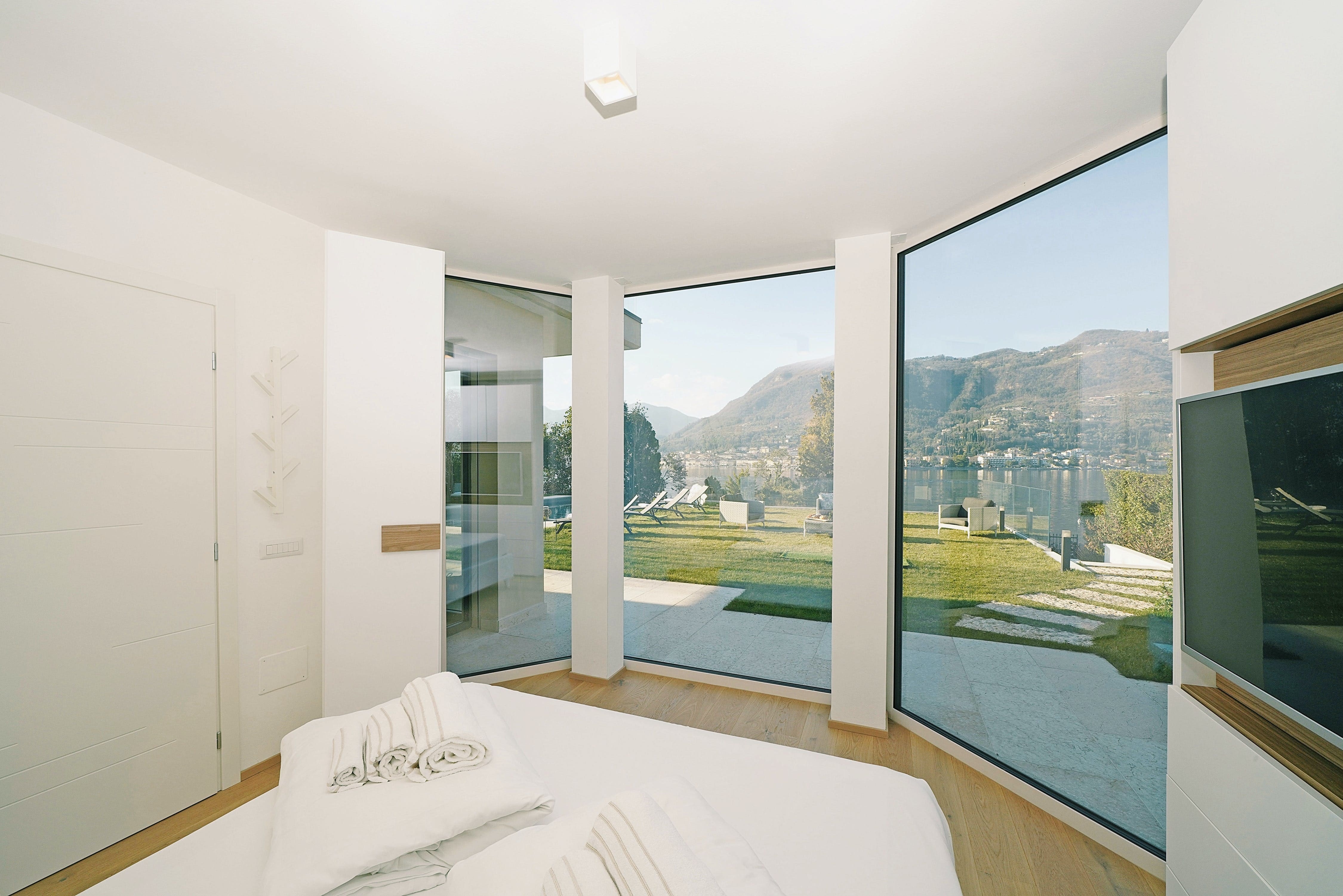 The interior of Casa Sanmicheli is a testament to modern elegance, featuring spacious living areas designed for comfort and style. The apartment is divided into two connected yet distinct units, each offering a unique perspective of the stunning lake views. The living area includes a cozy sofa bed for additional guests, while the state-of-the-art kitchen is perfect for preparing gourmet meals. Each bedroom is tastefully decorated, ensuring a restful retreat after a day of exploration.