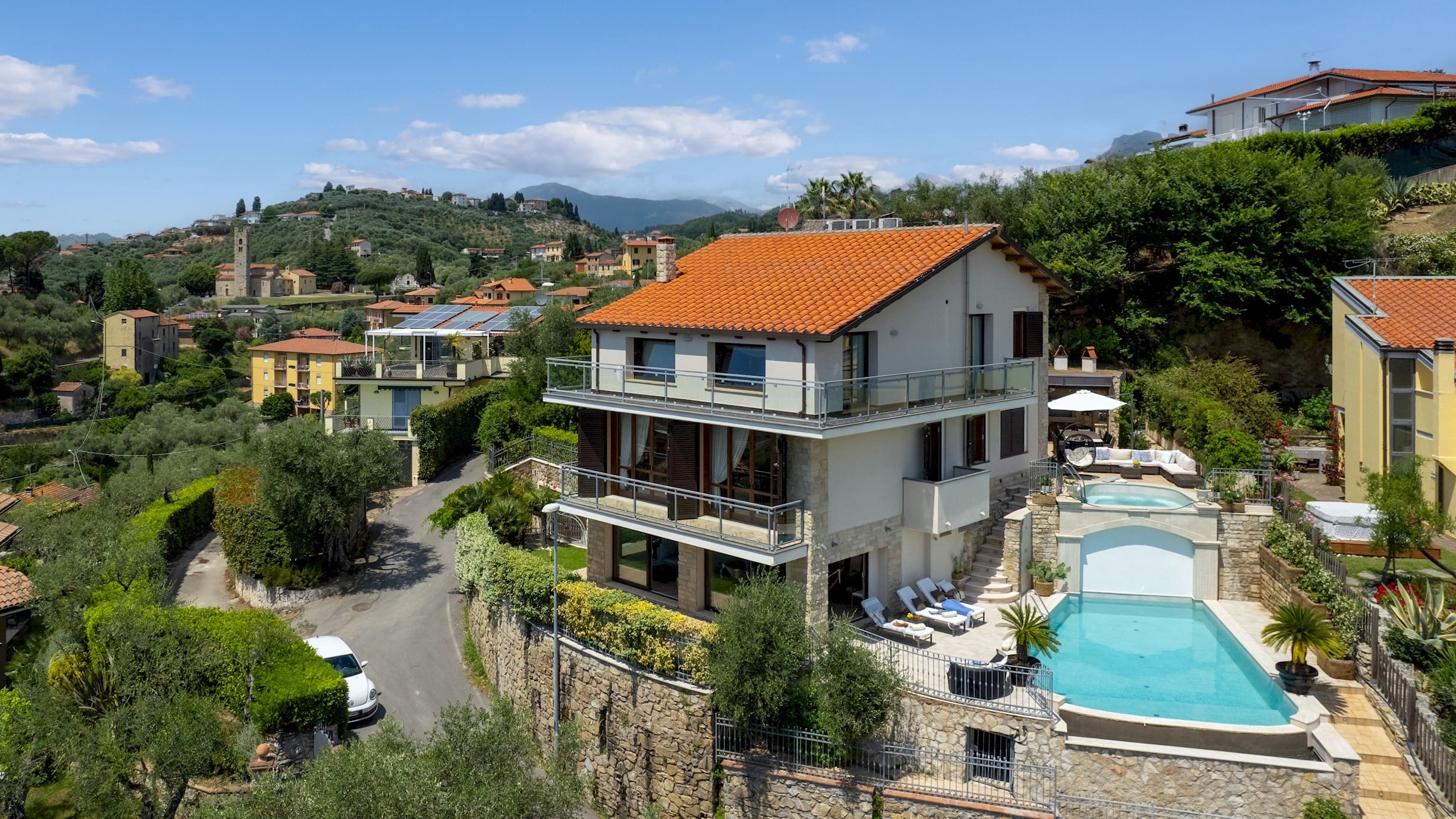 Viareggio is a vibrant coastal town known for its beautiful beaches and lively promenade. Guests can explore the nearby towns of Lucca and Pisa, each less than an hour’s drive away. The region is rich in cultural sites, including the famous Leaning Tower of Pisa and the historic city walls of Lucca. For a complete list of luxury villa rentals in Viareggio, explore our collection. For more on what to see and do, visit the Viareggio tourism guide.