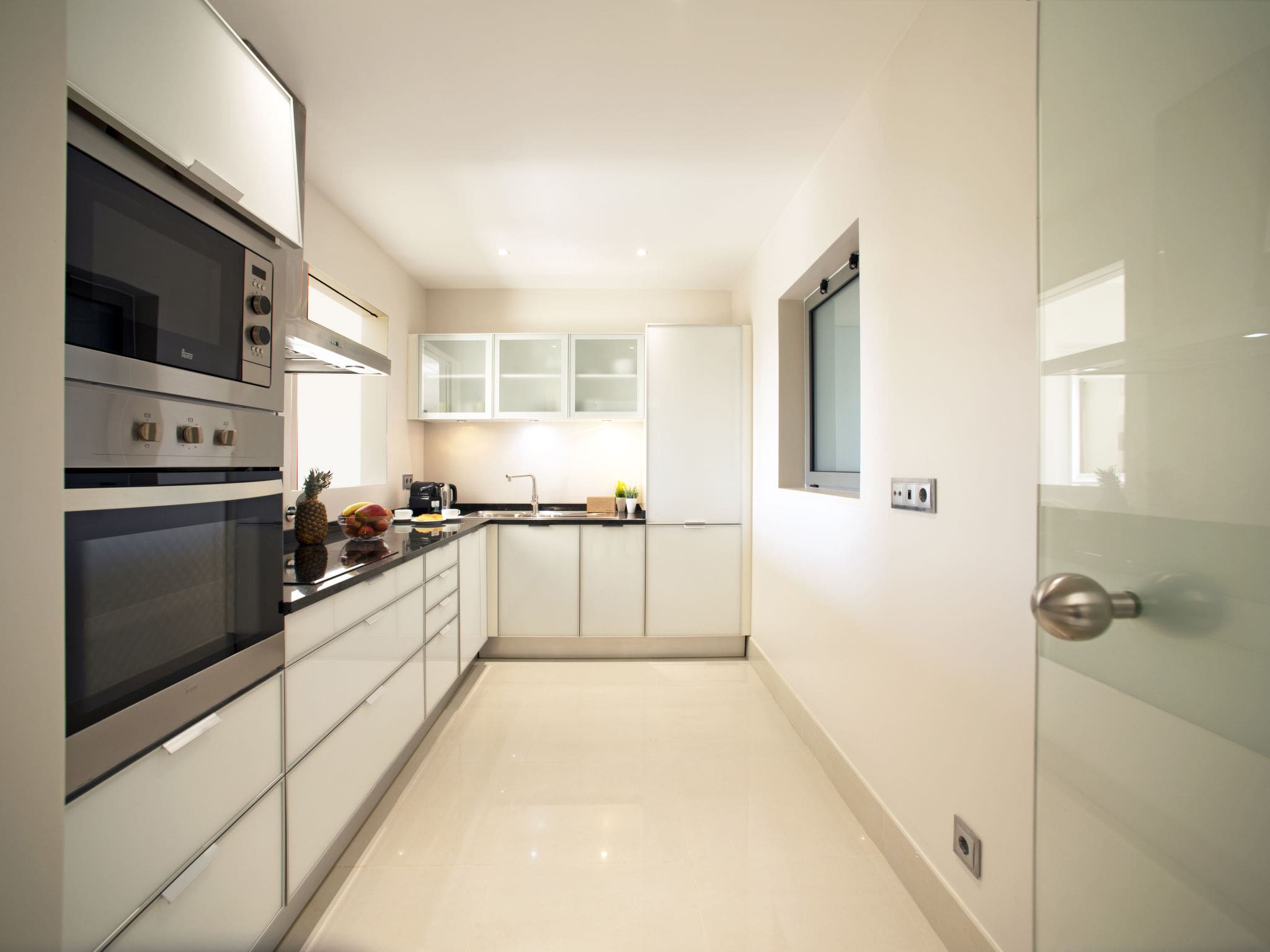 The heart of the home centers around a spacious living and dining area, complete with modern furnishings, international satellite television, and air conditioning throughout. The fully equipped kitchen features premium appliances including an oven, dishwasher, ceramic hob, microwave, and Nespresso coffee machine, ensuring every culinary need is met. Additional conveniences include a washing machine, iron, WiFi internet, and baby equipment for families traveling with young children.