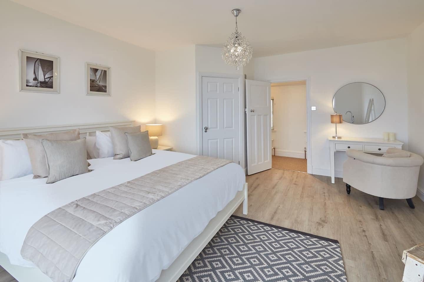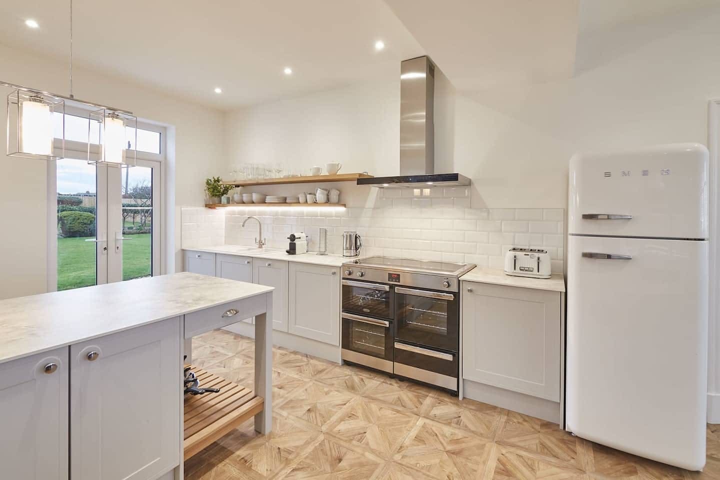 The interior of this Whitby apartment exudes elegance and comfort, designed to accommodate up to 11 guests across five well-appointed bedrooms. The living room invites relaxation with its cosy fireplace and plush seating, ideal for unwinding after a day at the beach. The kitchen serves as the heart of the home, featuring marble countertops and a large dining table perfect for family gatherings. French doors open to reveal a private garden, where guests can enjoy the fresh sea breeze.