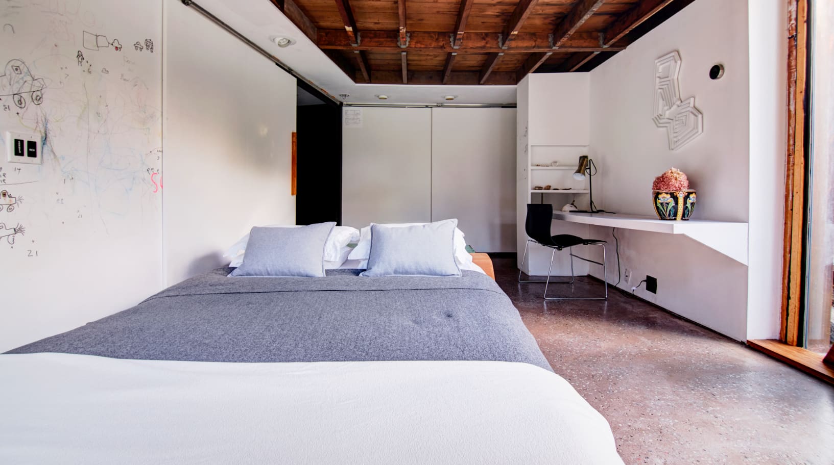 Once a creative studio, the interior of this house has been thoughtfully transformed into a beautiful family home. The living spaces are artfully designed, featuring expansive ceilings and enormous windows that flood the area with natural light. The integration of concrete and wood elements adds an elegant touch, while the open-plan living area offers a relaxed atmosphere. The kitchen is fully equipped for all your culinary needs, and the three bedrooms provide ample space for rest and relaxation, comfortably accommodating up to five guests.