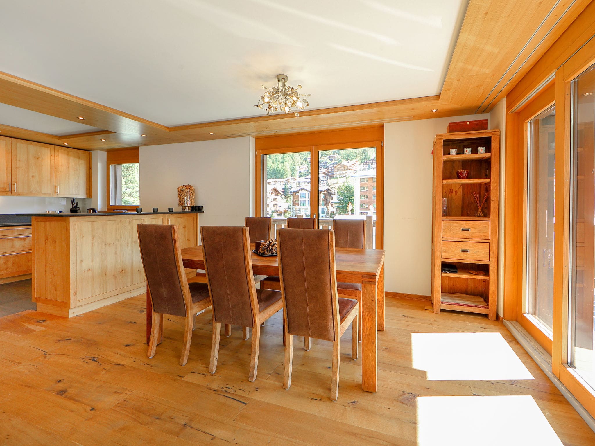 Multiple balconies extend the living space outdoors, with south-facing terraces capturing maximum sunshine throughout the day. The morning light filters through the east-facing balconies, while the north-facing terrace provides cool evening relaxation spots with dramatic mountain backdrops. The property’s position ensures guests enjoy unobstructed views of the iconic Matterhorn peak, creating picture-perfect moments throughout their stay. The building’s sunny south-facing position maximizes natural light and warmth during winter months.