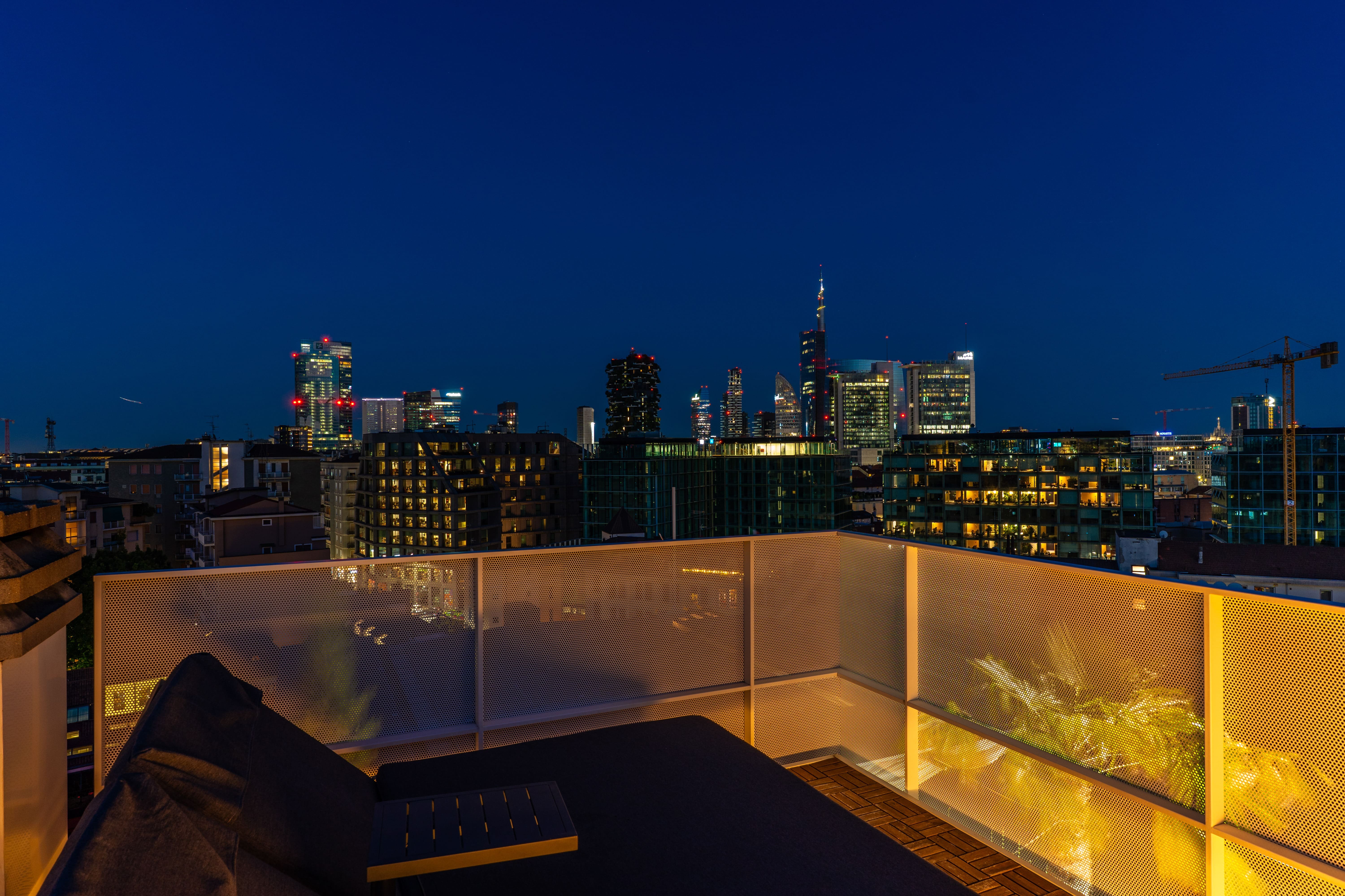 The penthouse’s outdoor area is a true oasis, featuring a heated swimming pool with a counter-current system for year-round enjoyment. Relax in the hot tub or indulge in the sauna after a day exploring Milan. The spacious terrace offers panoramic views of the city skyline, making it an ideal spot for al fresco dining or simply unwinding with a glass of wine.