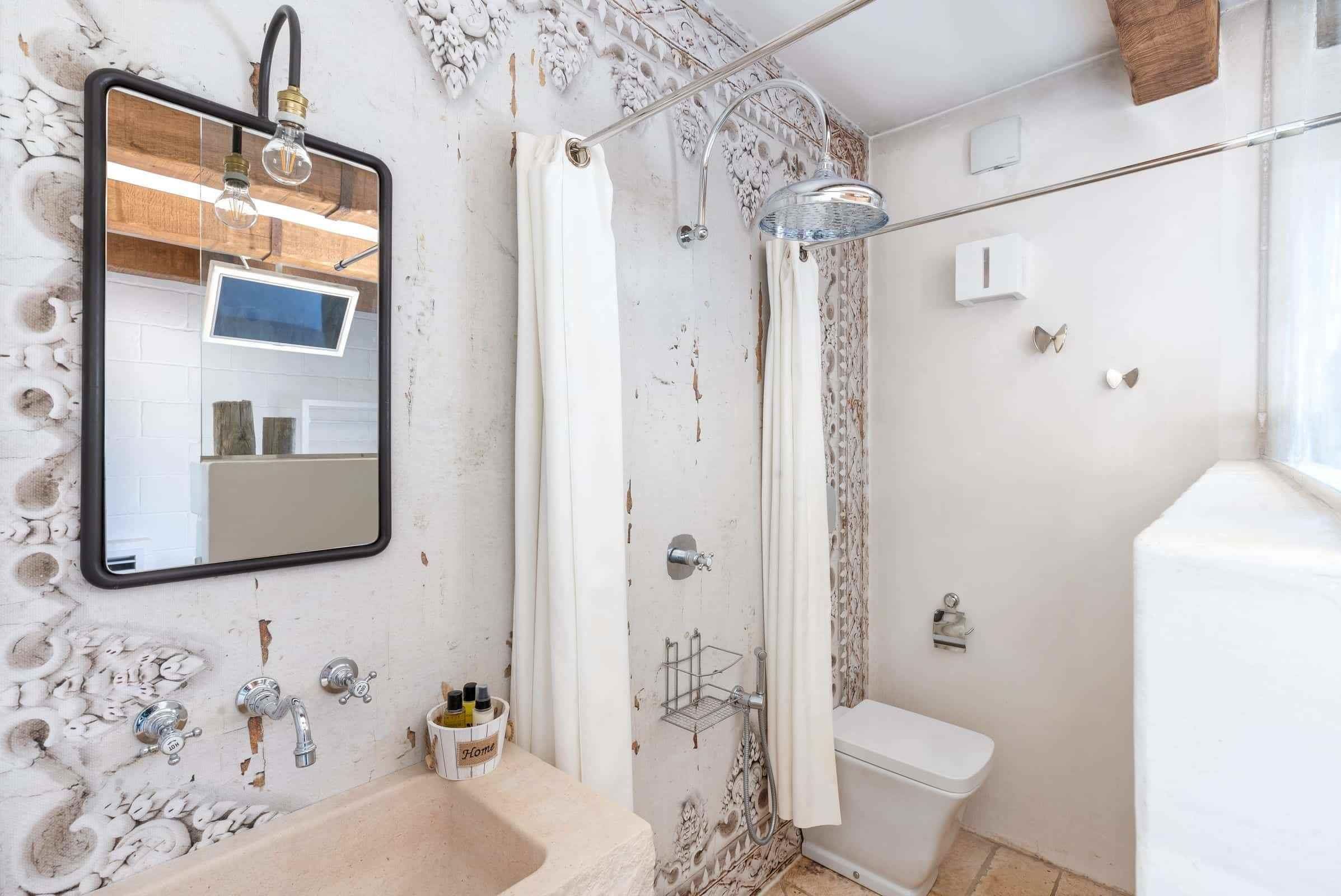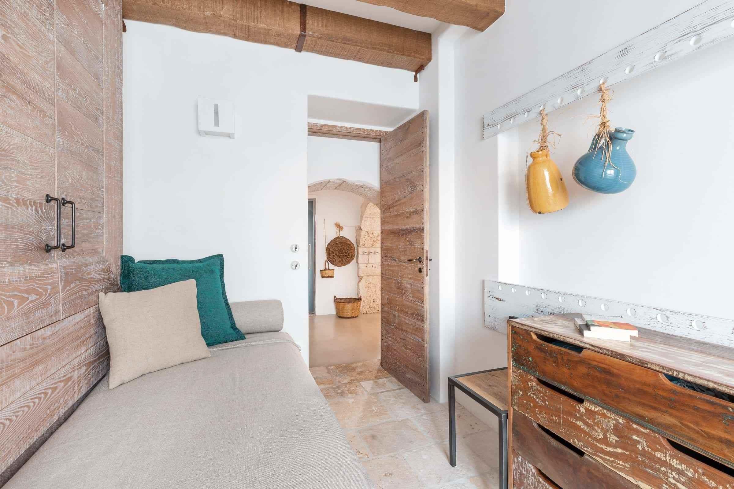 Step inside to discover a harmonious blend of rustic charm and contemporary style. The apartment boasts five spacious bedrooms, each with its own en-suite bathroom, ensuring privacy and comfort for all guests. The main bedroom suite includes a kitchenette and a cozy sitting area for those seeking a bit more seclusion. The open-plan living area, adorned with elegant Mediterranean ornaments and ancient local stone, invites you to unwind and socialize. The colorful kitchen, with its farmhouse feel, is equipped to inspire culinary creativity.