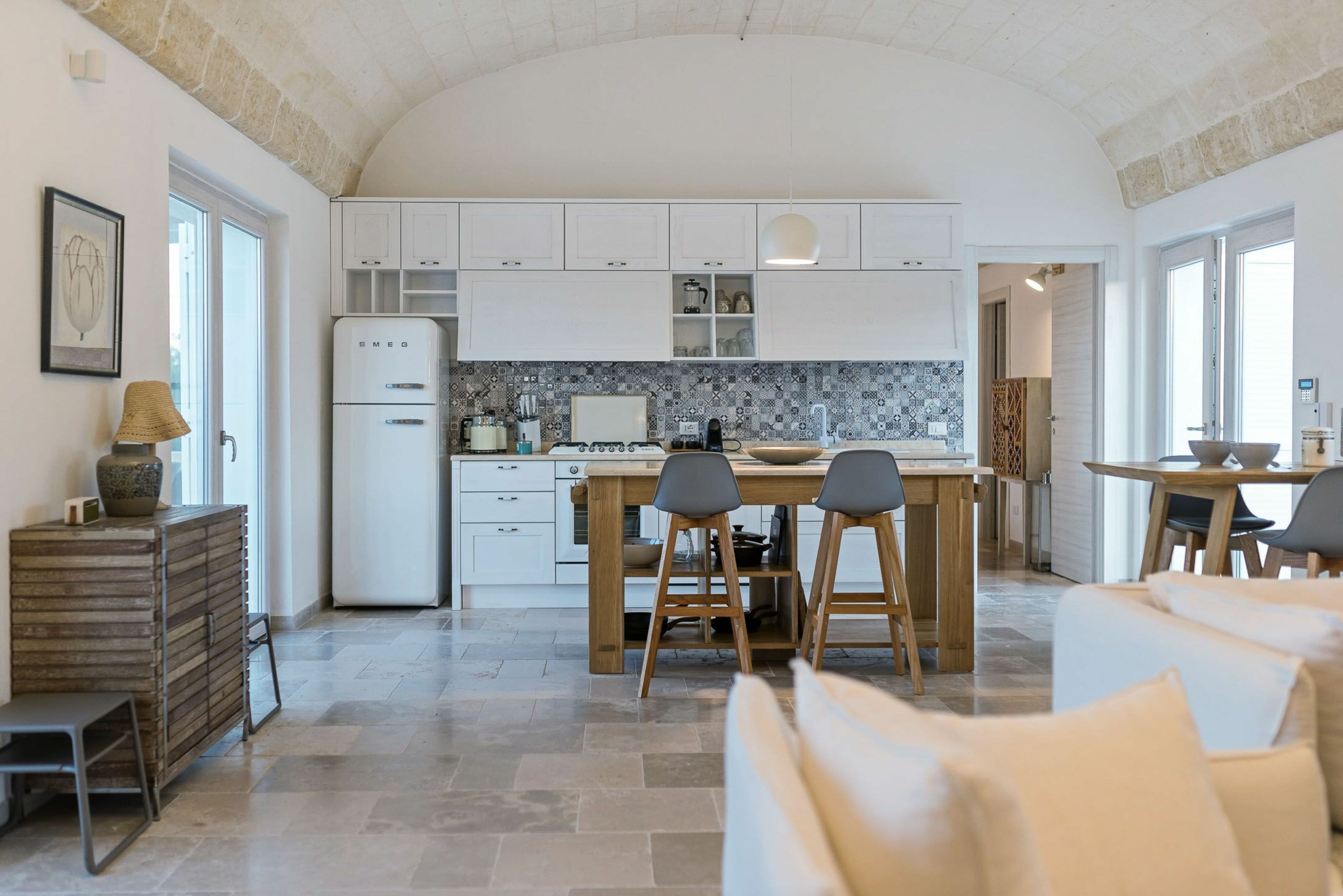 Step inside to find a beautifully designed interior that embraces the local architectural style. The apartment features three spacious bedrooms and two bathrooms, comfortably accommodating up to six guests. The living area is a haven of relaxation, with its airy open-plan layout, high barrel vault ceilings, and an abundance of natural light. The modern kitchen is equipped with premium Smeg appliances, ideal for preparing delicious meals. A cozy lounge area with a fireplace invites you to unwind after a day of exploring.