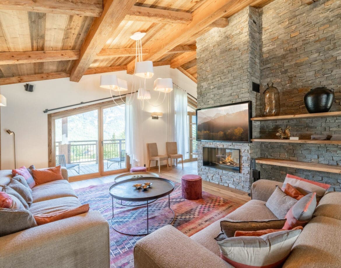 Ascending to the pinnacle of the chalet, Chalet Pomme’s living area welcomes you with open arms. Divided into a lounge, a fully equipped kitchen, and a dining area, all anchored by a central fireplace, this space serves as the heart of social gatherings. Floor-to-ceiling bay windows open onto a terrace and balcony, unveiling a breathtaking panorama of the valley below.