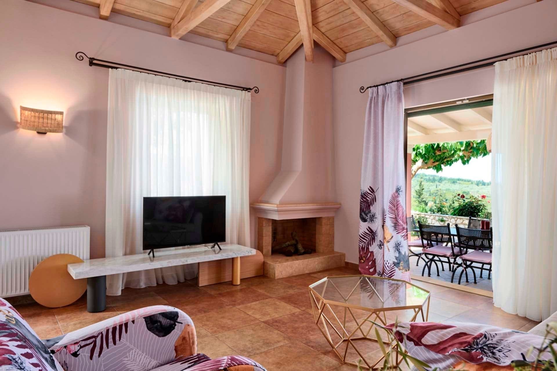 The apartment’s outdoor spaces are designed for relaxation and enjoyment. A private swimming pool and separate children’s pool offer refreshing dips, while the hot tub provides a soothing escape. With panoramic views of the Ionian Sea, the terrace becomes a favorite spot for unwinding, whether soaking up the sun or enjoying a sunset dinner.